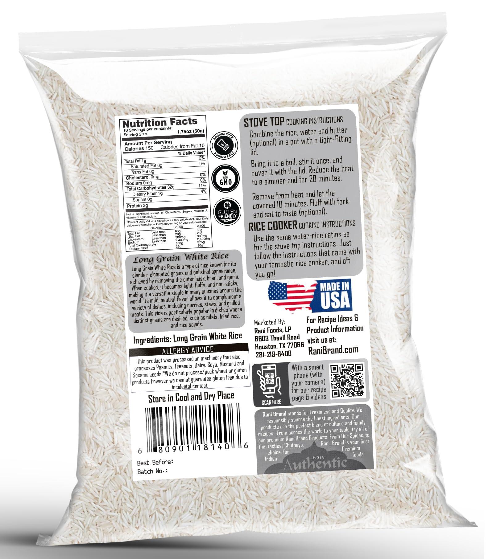 Q: How should I cook Rani Long Grain White Rice for the best results?A: For optimal results, rinse the rice before cooking to remove excess starch. Use a ratio of 1 cup of rice to 2 cups of water. Bring to a boil, then simmer on low heat for about 18-20 minutes until water is absorbed and rice is fluffy.