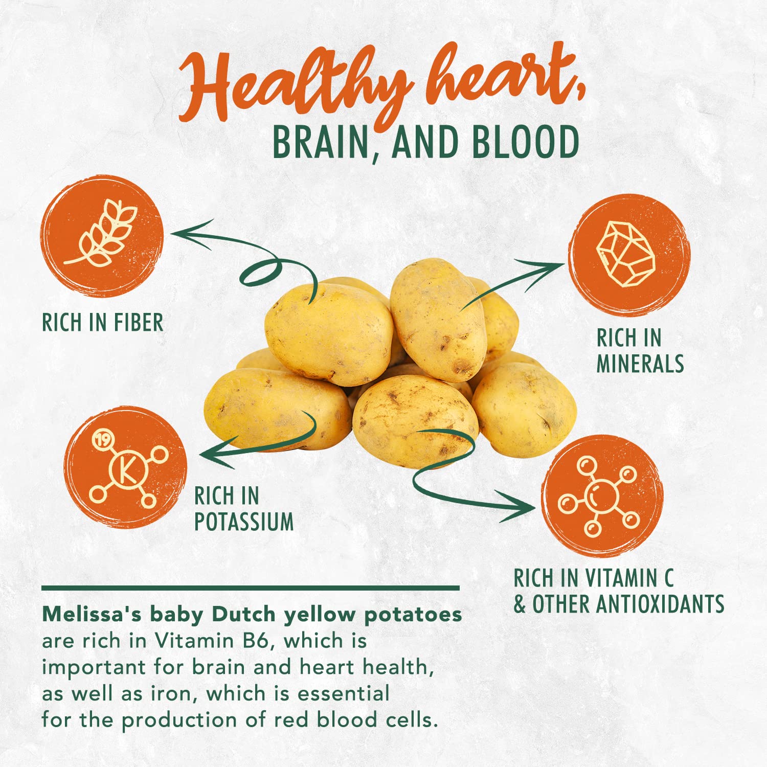 Q: Are Melissa's Baby Dutch Yellow Potatoes healthy?A: Yes, these baby potatoes are loaded with nutrients. They are a good source of Vitamin C, B6, iron, and protein, while being naturally fat and cholesterol-free, with only 70-110 calories per serving.