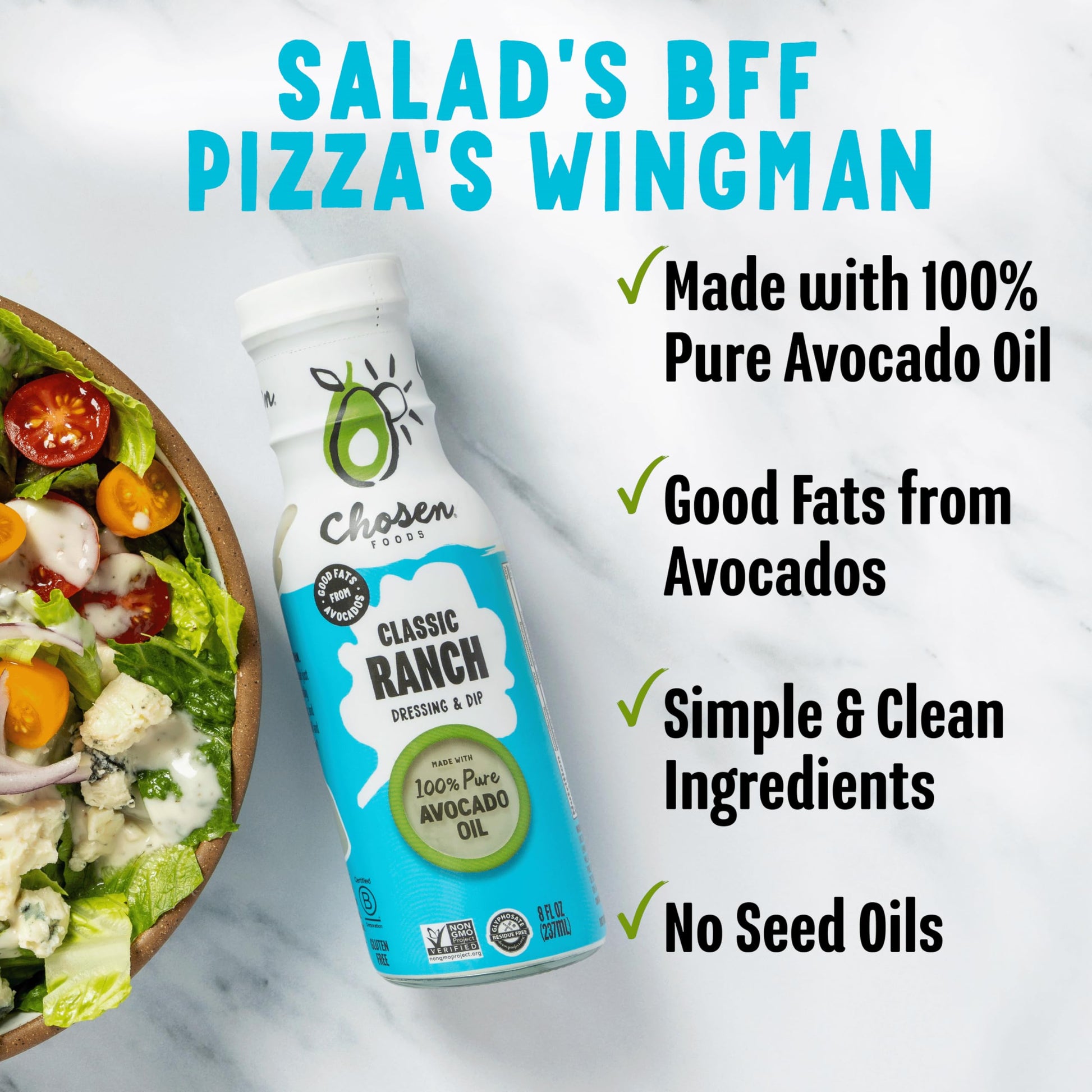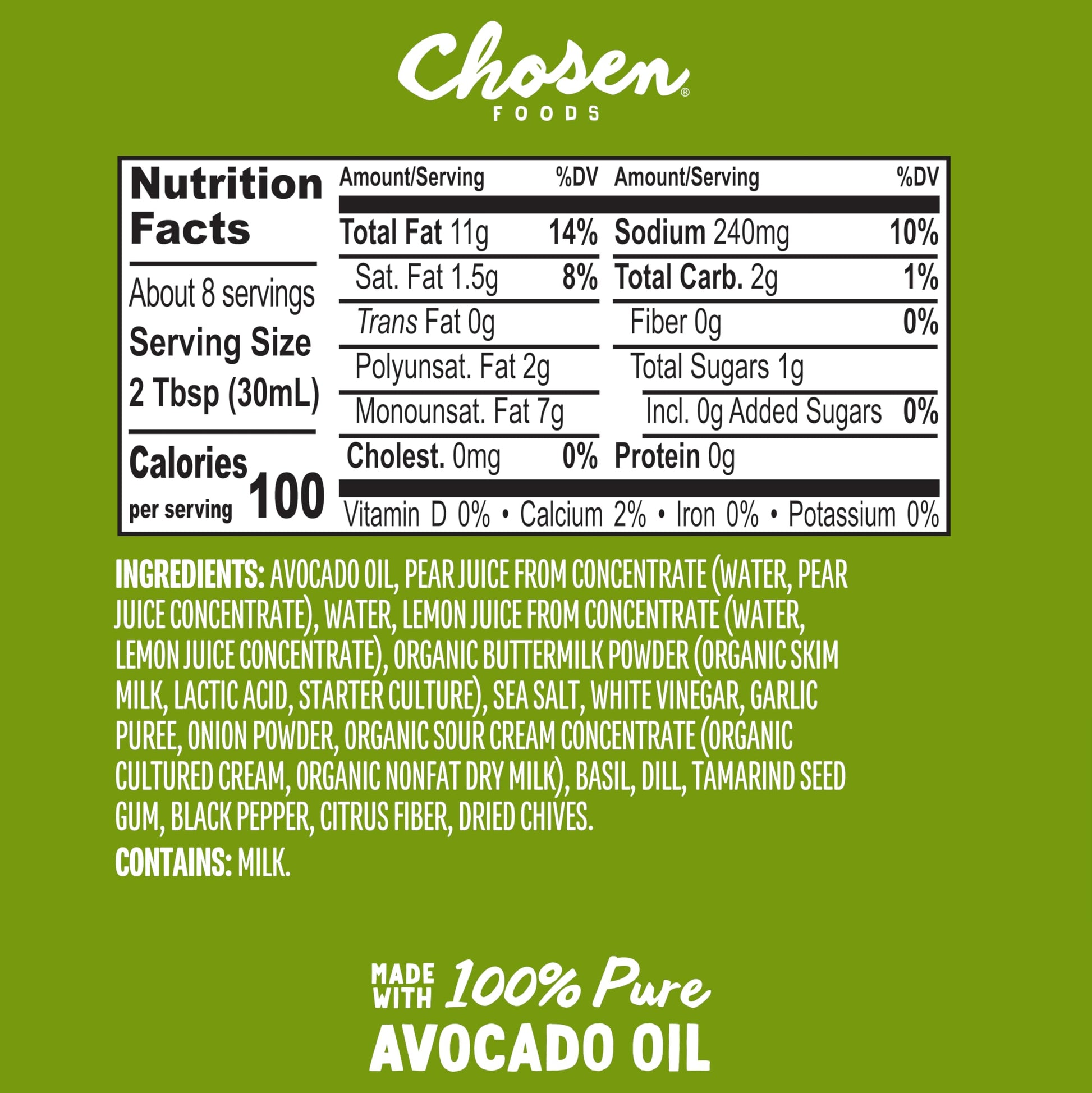 Q: What are the main ingredients in Chosen Foods Classic Ranch Dressing?A: Chosen Foods Classic Ranch Dressing is made with 100% pure avocado oil and simple ingredients, ensuring there are no natural flavors, artificial ingredients, or hidden additives. This makes it a clean and healthy choice for your salads and dips.