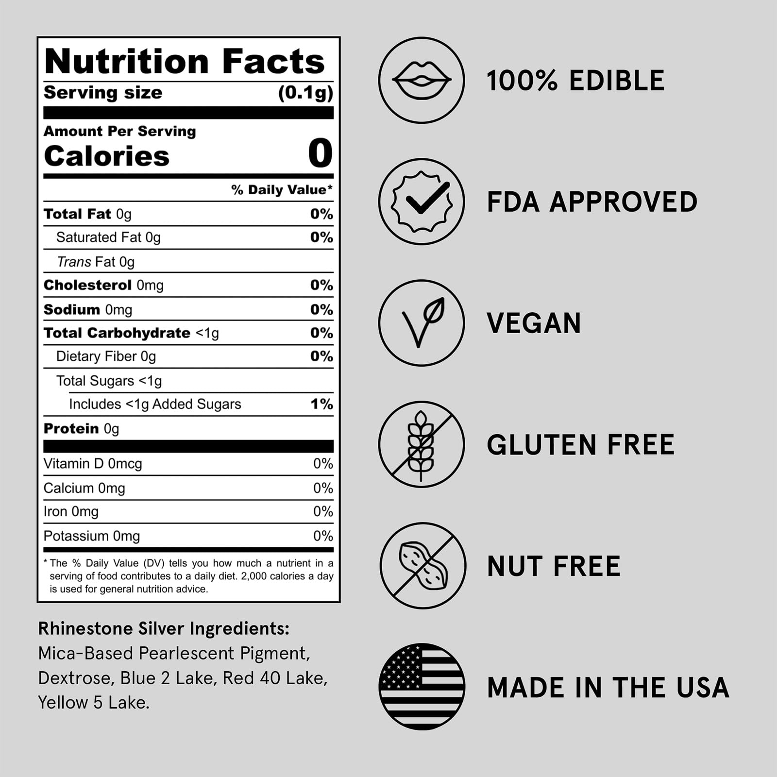 Q: What are the ingredients in Fancy Sprinkles Rhinestone Silver?A: The main ingredients in Fancy Sprinkles Rhinestone Silver include mica-based pearlescent pigment and iron oxide, making it safe for consumption in food and drinks.