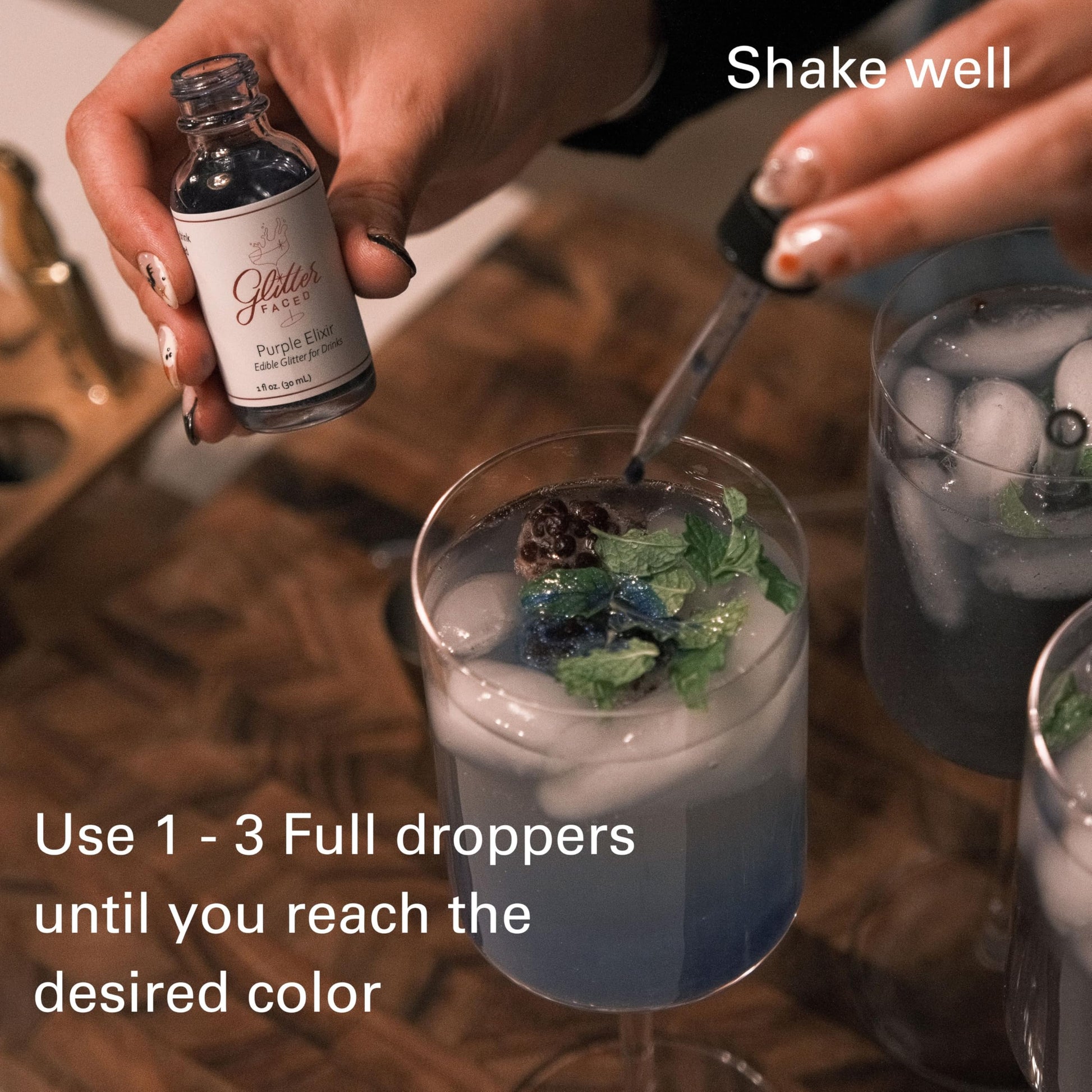 - Q: How do I use Glitter Faced Edible Glitter Elixir Drops in my drinks? A: Using Glitter Faced Edible Glitter Elixir Drops is simple! Just open the bottle and drop 1 to 3 full droppers into your drink. The glitter will dissolve and create a mesmerizing swirl, adding a magical sparkle to your cocktails and mocktails.