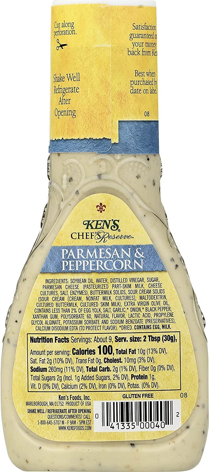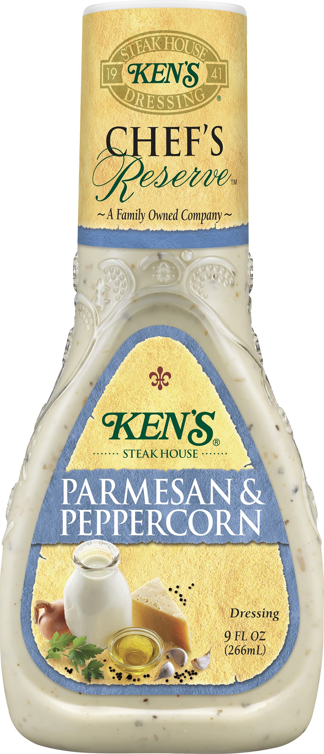 Q: What are the main ingredients in Ken's Steak House Parmesan Peppercorn Dressing?A: Ken's Steak House Parmesan Peppercorn Dressing is made with grated Parmesan cheese and cracked black pepper, creating a thick and creamy texture that enhances the flavor of your salads and dishes.