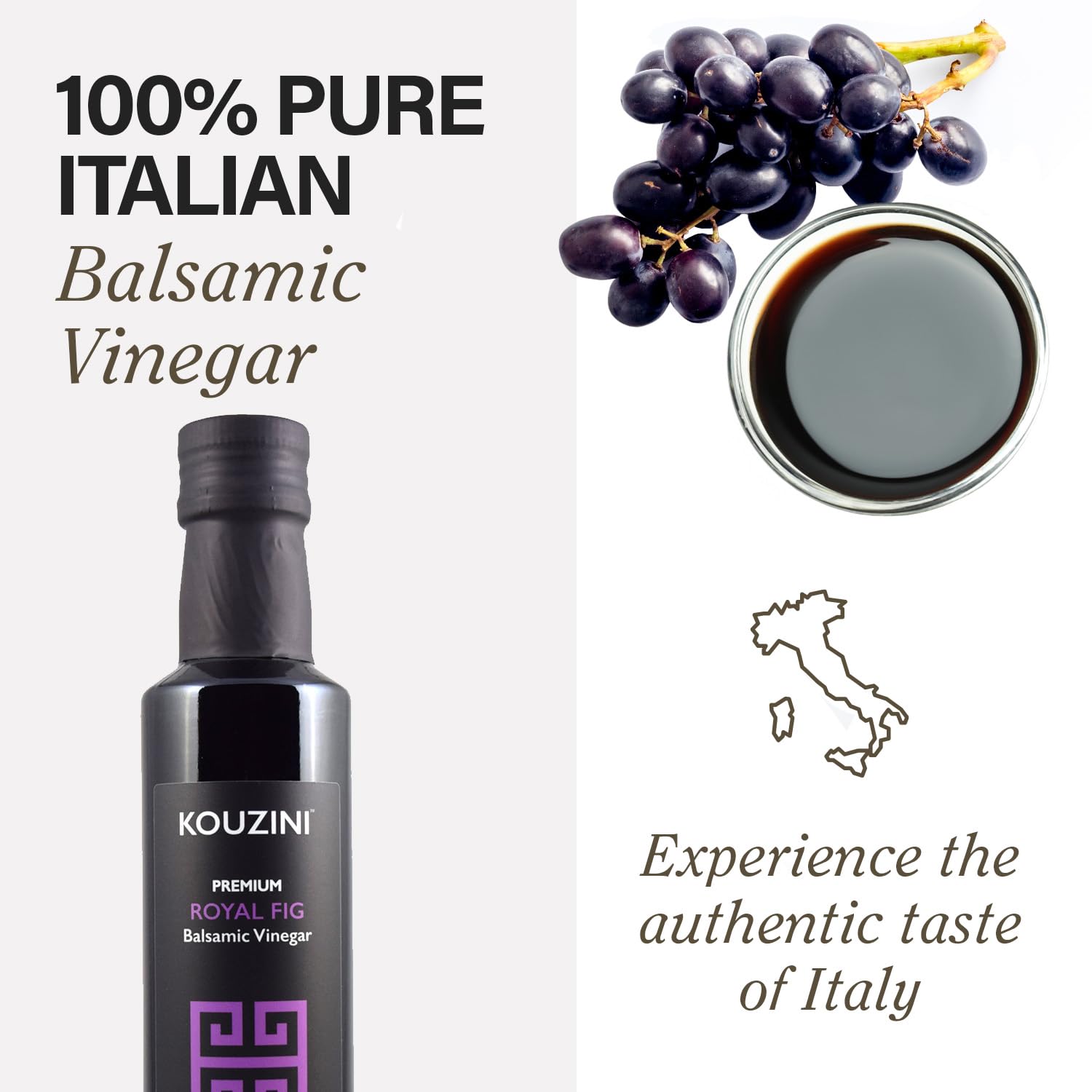 - Q: What makes Kouzini Ultra Premium Royal Fig Balsamic Vinegar unique? A: Kouzini Ultra Premium Royal Fig Balsamic Vinegar is unique due to its exceptional flavor profile, combining the sweetness of figs with the tangy notes of aged balsamic vinegar from Modena, Italy. It is made with high-quality, fresh ingredients and contains no preservatives, artificial colorings, or added sugars.