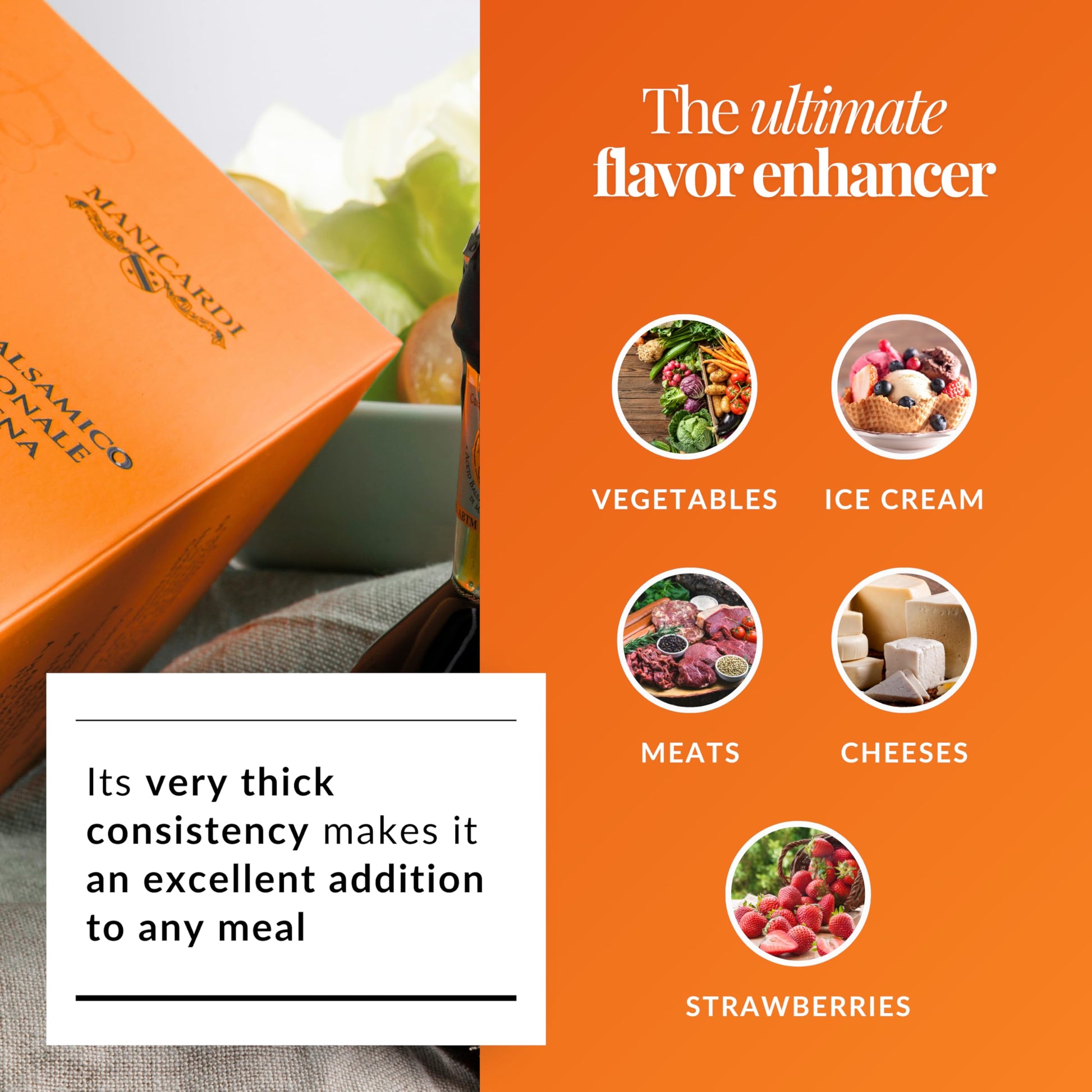 - Q: What makes MANICARDI Traditional Balsamic Vinegar of Modena PDO unique? A: MANICARDI Traditional Balsamic Vinegar is unique due to its 25-year aging process in wooden barrels made from various types of wood, including chestnut and cherry. This extensive aging contributes to its rich flavor profile and thick consistency, certified by the Consorzio of Traditional Balsamic Vinegar Producers in Modena.