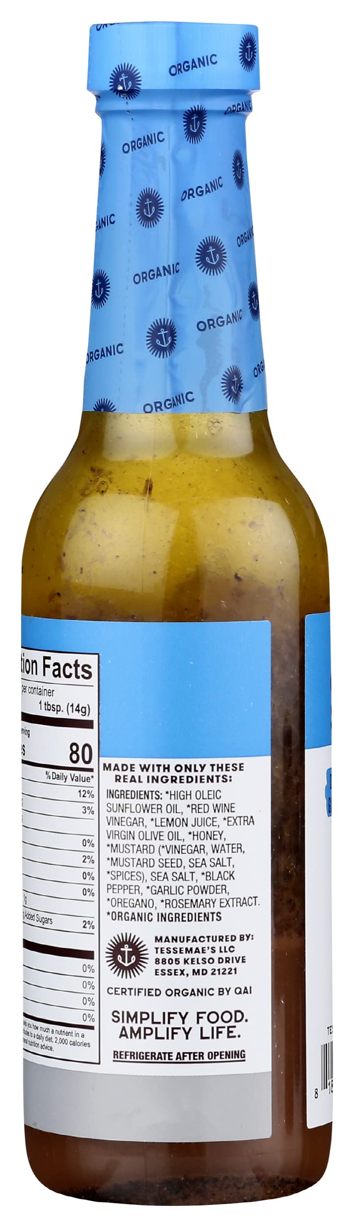 - Q: What are the main ingredients in Tessemae's Classic Greek Dressing? A: Tessemae's Classic Greek Dressing is made with high oleic sunflower oil, honey, white balsamic vinegar, red wine vinegar, mustard, poppy seeds, onion powder, black pepper, and various organic ingredients, ensuring a fresh and flavorful experience.