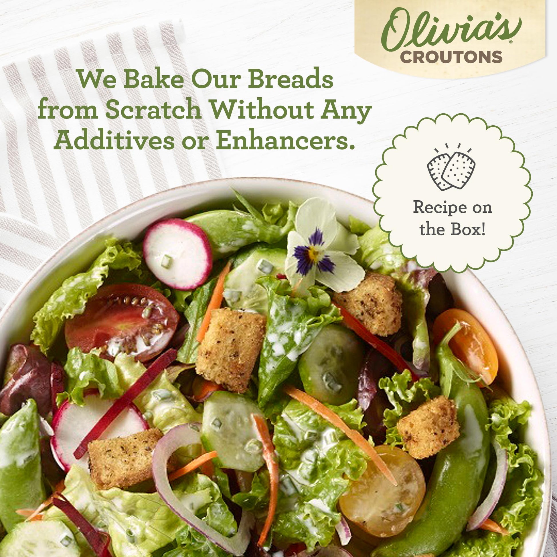 Every Morning, We Light The Ovens In Our Family-Run Vermont Bakery. To Make Artisan Gluten-Free Bread For Your Croutons. Each Carefully Perfected Loaf Is Made With Ancient Whole Grains Like Millet, Sorghum And Brown Rice. After Baking Under Our Watchful Eye, The Wholesome Bread Is Chopped Into Hearty Homestyle Chunks. These Tasty Morsels Are Then Seasoned While Still Fresh, To Soak Up Every Bit Of Flavor Possible From Fresh Garlic, Rosemary, Black Pepper And Parsley. No Trans Fats, No High Fructose Corn Syrup, No Added Sugar And No Extra Salt. Because Artificial Ingredients Wont Do For Your Family...Only Real And Natural Ingredients.Multi-Pack Of Olivias Garlic Gluten Free Croutons, 3 Boxes (4.5-Oz Each). These Vegetarian Croutons Are Your Go-To Garlic Garnish For Kale Salads And Caesar Salad Kits. You Can Rest Assured That Our Extra Crunchy Croutons Wont Get Soggy In Your Creamy Carrot Soup Or Tomato Soup. What A Tasty Way To Please The Different Palates And Diets In Your Household! Add Our Premium Gluten-Free Croutons To Your Family Grocery List.Olivias Croutons Is Named After Francies Daughter, Olivia. Francie Founded This Woman-Owned Business In 1991. And Dedicated It To Making The Family Friendliest Croutons On The Market, With Only Wholesome Ingredients And Yummy Real Flavors. Thats A Promise, From Francies Family To Yours.Francies Home Cooking Tip: Get Crouton Creative! Blend Or Pulse These Garlic Croutons To Make Easy Gluten-Free Panko Breadcrumbs. A Delicious Coating For Gluten-Free Chicken Parmesan Or A Crispy Topping For Vegetarian Casseroles. Combine Olivias Croutons With Celery, Onion And Bone Broth For Gluten-Free Stuffing At Thanksgiving. Toss With Tomatoes And Italian Cheese For Summer Panzanella Salad. Dont Be Shy, Grab A Handful Right Out Of The Box For A Healthy Gluten-Free Snack!