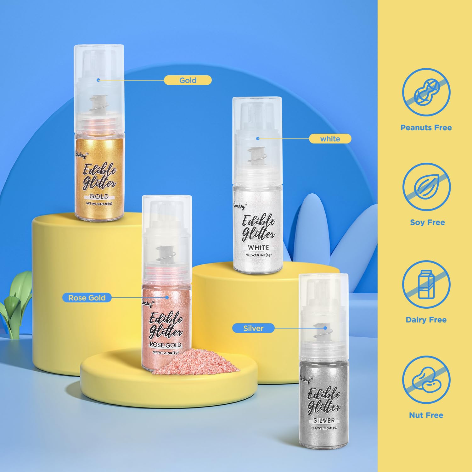 Q: How can I use the edible glitter spray?A: The edible glitter spray is designed for easy application. Simply use the spray pump on desserts like cakes, cupcakes, and cookies, or add it to cocktails and drinks just before serving for a magical shimmer.