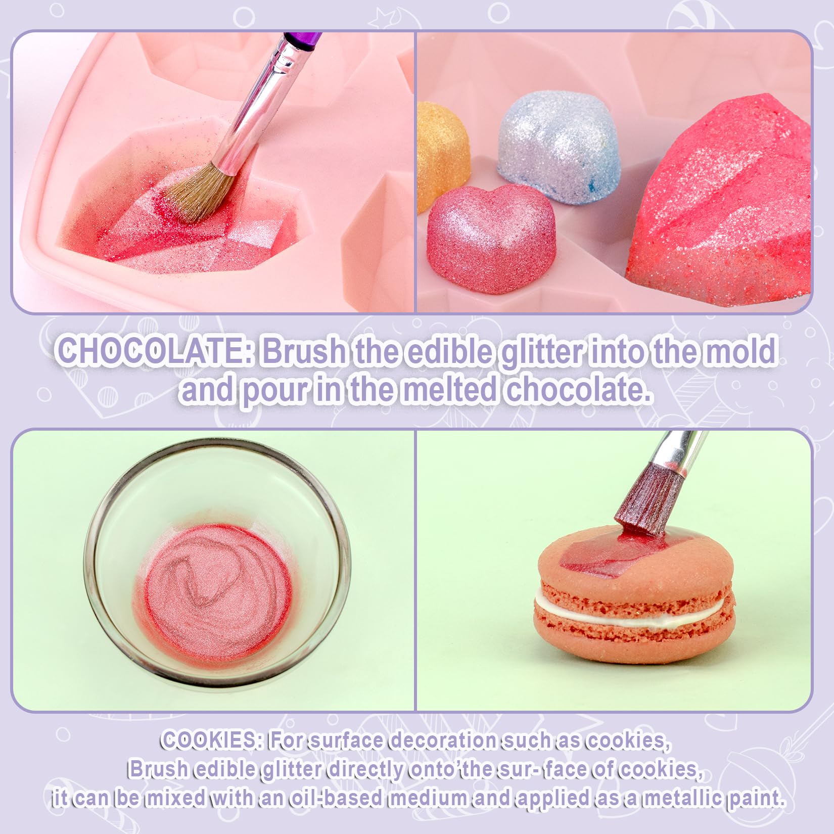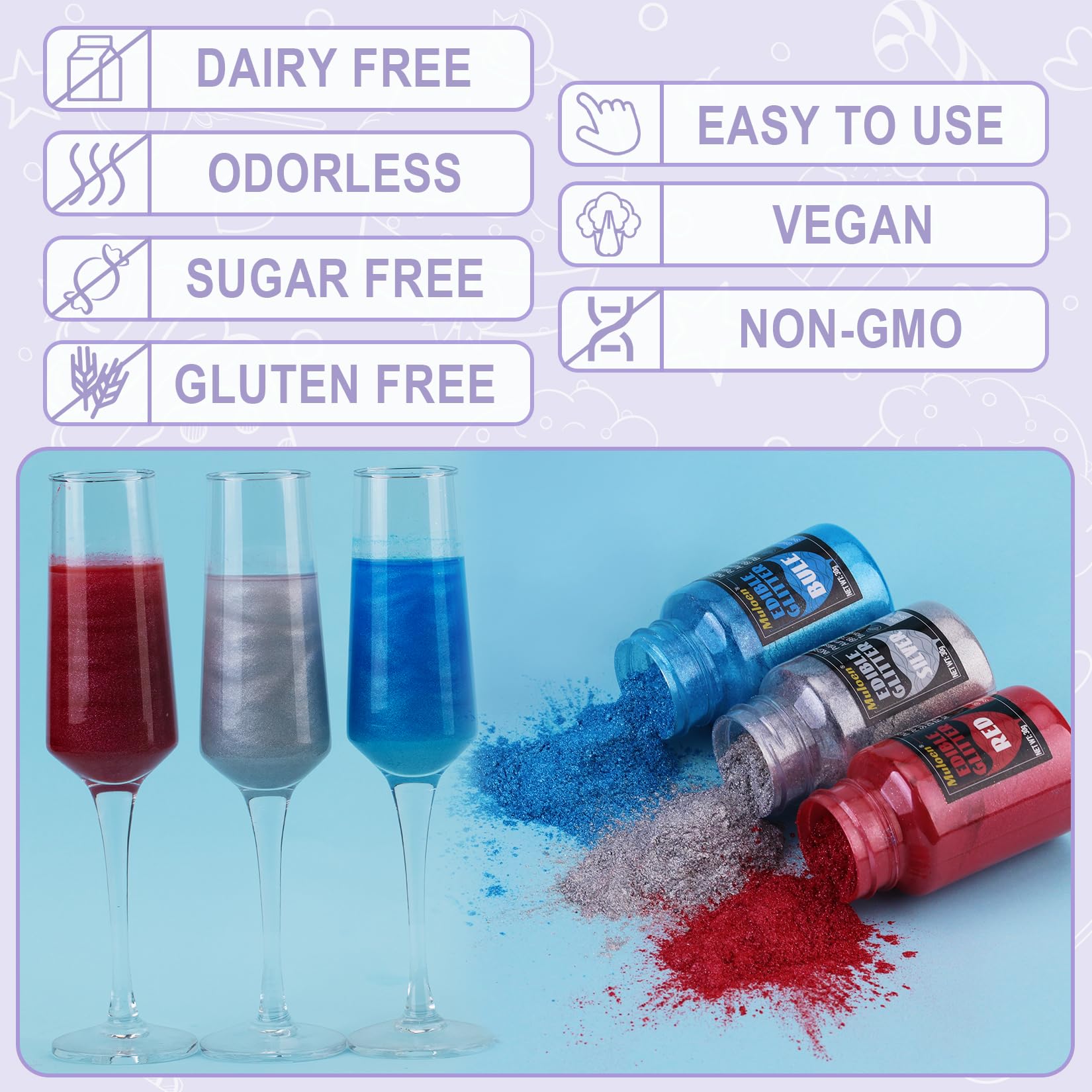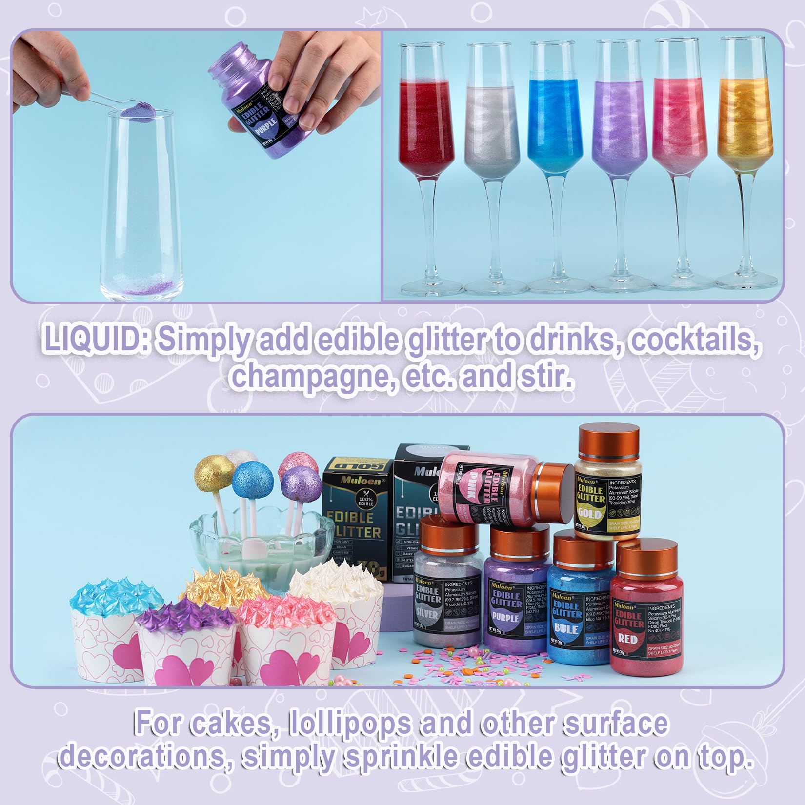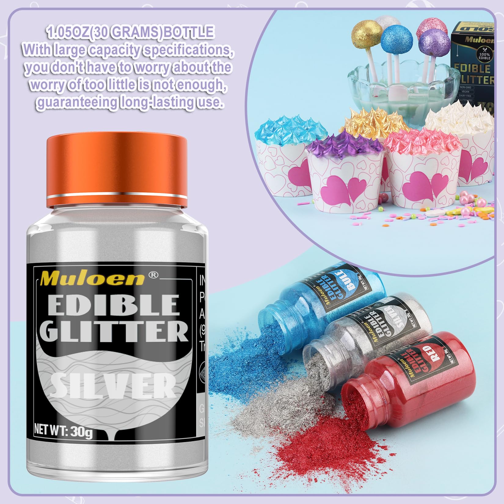Q: What colors are available for the edible glitter?A: Our Silver Edible Glitter is available in a total of 6 vibrant colors: gold, red, pink, purple, silver, and blue, allowing you to choose the perfect shade to enhance your desserts and drinks.
