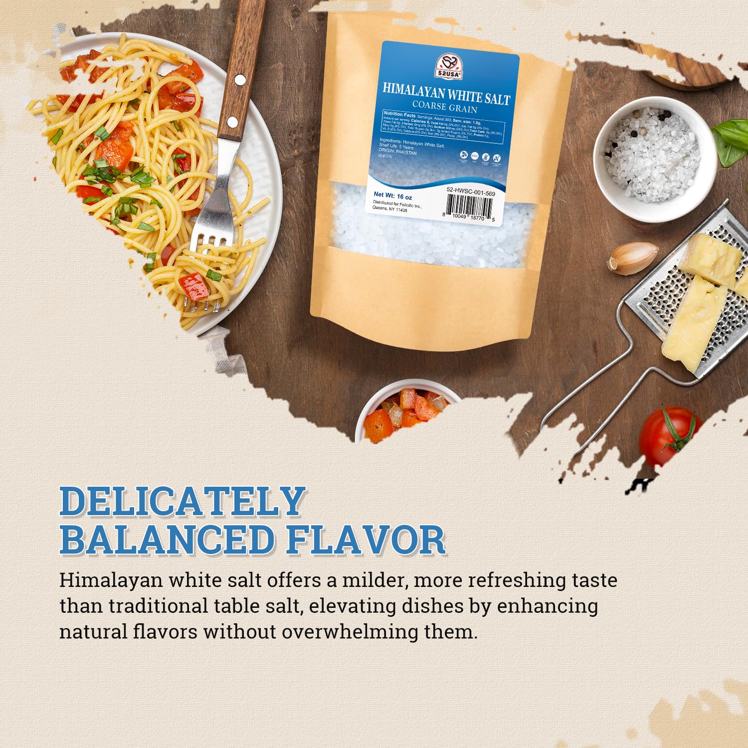 100% Pure Himalayan White Salt: Sourced from ancient salt deposits, our coarse grain white salt is all-natural, unrefined, and rich in essential minerals for enhanced flavor and nutrition. | Perfect for Grinders and Seasoning: The coarse grain size is ideal for refillable salt grinders, adding a burst of freshness to your dishes with every grind. Great for cooking, baking, and seasoning. | Versatile Culinary Uses: Elevate your culinary creations by using this salt to season meats, vegetables, soups, and salads, or as a finishing touch for your favorite recipes. | Rich in Minerals and Trace Elements: Packed with naturally occurring minerals like calcium, magnesium, and potassium, this salt supports a balanced diet and healthy lifestyle. | Sealed for Freshness: Conveniently packaged in a 1 lb bag to maintain quality and purity. Store in a cool, dry place for lasting freshness and flavor.