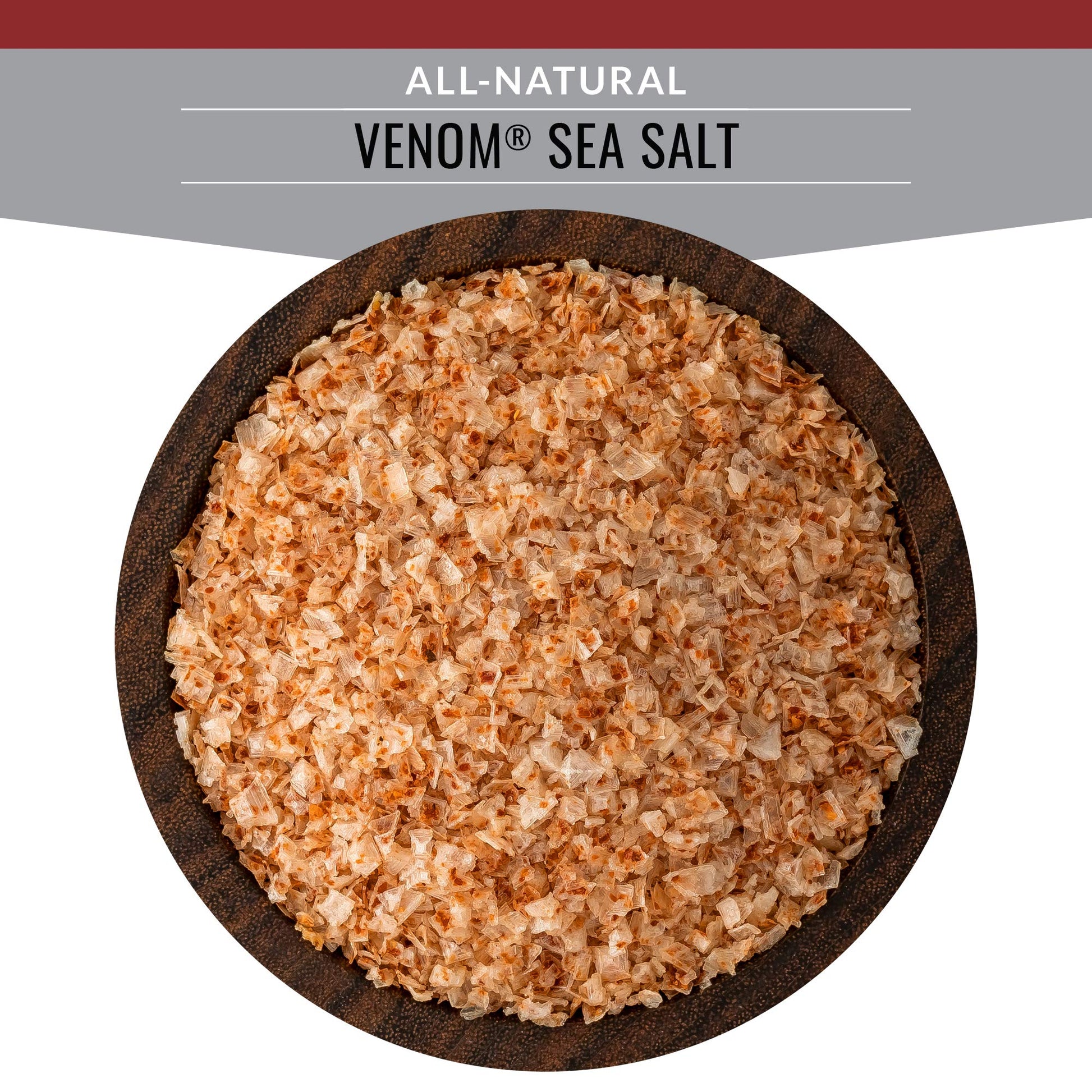 With venom sea salt, Its easy to bring Blazing heat to ribs, burgers, shrimp-even popcorn. Made with light, delicate flakes of pure, natural sea salt and scorching Trinidad Scorpion peppers, venom sea salt is a natural way to add some fire to spice rubs, BBQ sauces and Guacamole recipes. With heat so intense we had to add a warning label, a little bit goes a long way, but youll want to add it to everything that deserves to leave a lasting impression.