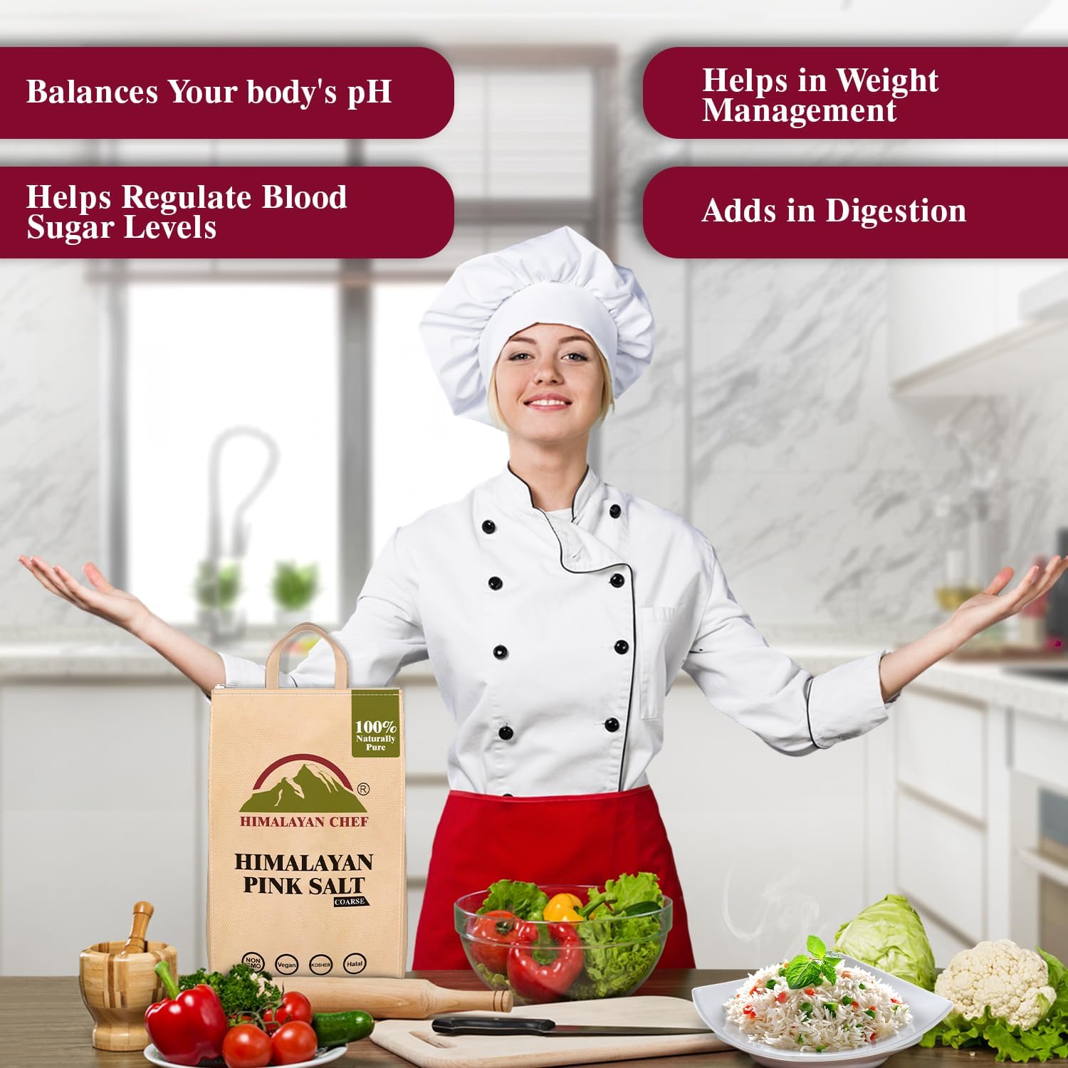 Himalayan Chef offers Himalayan Pink Salt which is available in supreme quality safe food service bag. It contains 5 lbs salt. Pink salt bag looks elegant and attractive on your kitchen counter. Our Himalayan Chef Pink Himalayan Salt is perfect for everyday culinary use, offering versatile applications. Whether you prefer grinding it directly onto your food, using it as a salt rub, incorporating it into brine solutions, or blending it with herbs to create distinct flavors, this salt is an ideal choice. It brings outstanding seasoning to meats, grilled vegetables, various salads (such as pasta, egg, or potato salads), soups, stews, and enhances the taste of baked goods. We take pride in sourcing the highest quality gourmet-grade Himalayan Salts directly from their origin. Pink Himalayan Salt, known for its purity and exceptional quality, stands out among all other salts worldwide. What makes Himalayan Salt truly unique is its distinctive mineral composition, which naturally imparts a range of captivating colors, ranging from pink to light red. When observed under a microscope, the salt crystals reveal intricate and precise geometric patterns, adding to its allure. Furthermore, you can experience the benefits of Himalayan Pink Salt by adding it to your baths, providing relief from muscle aches, soothing pains, and leaving your skin feeling softer. Please note that due to its unique mineral composition, Himalayan salts may take slightly longer to dissolve in water. The taste of this pink salt is truly exquisite, and its abundance of minerals adds to its overall appeal. Rest assured, our Himalayan salt is free from any additives, chemicals, or preservatives, making it widely regarded as one of the healthiest salt options available.