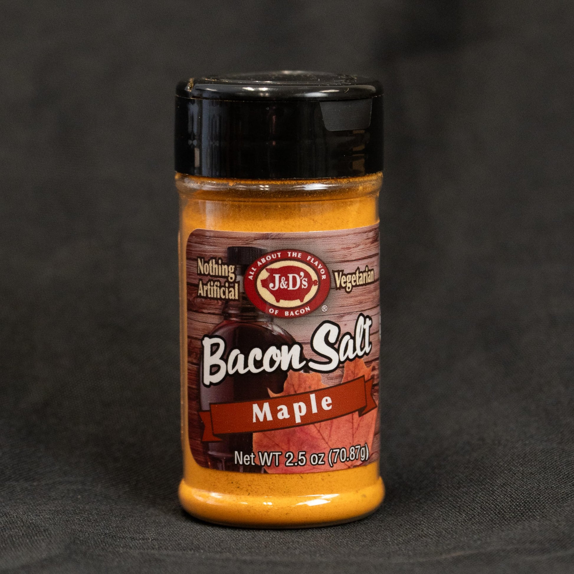 Introducing our NEW! J&Ds Maple Bacon Salt, where the savory flavor of bacon and sweet notes of maple combine into one delicious seasoning! In record time, this has become our go-to breakfast seasoning. 2.5 oz. Zero calorie Zero fat Vegetarian Kosher Low Sodium Nothing Artificial