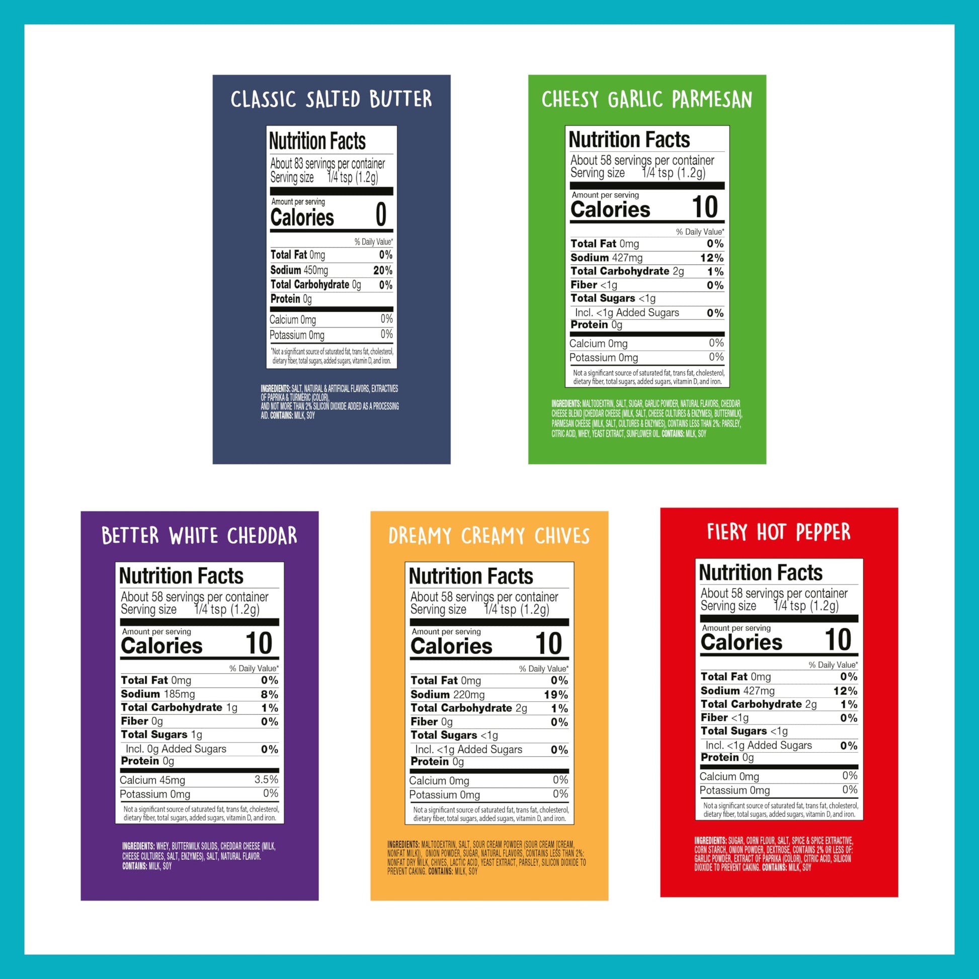 Q: What flavors are included in the Popcorn Seasoning Variety Pack?A: The Popcorn Seasoning Variety Pack includes five delicious flavors: Classic Salted Butter, Cheesy Garlic Parmesan, Better White Cheddar, Creamy Dreamy Chive, and Fiery Hot Pepper, allowing you to enjoy a unique taste experience.