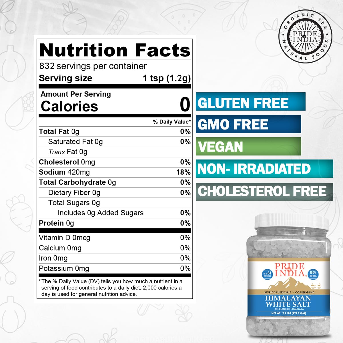 Pride of India- Himalayan White Salt Coarse Grind 2.2 lbs (997.90 gm)- Rarest & Enriched W/84+ Natural Minerals- Low Sodium- Min