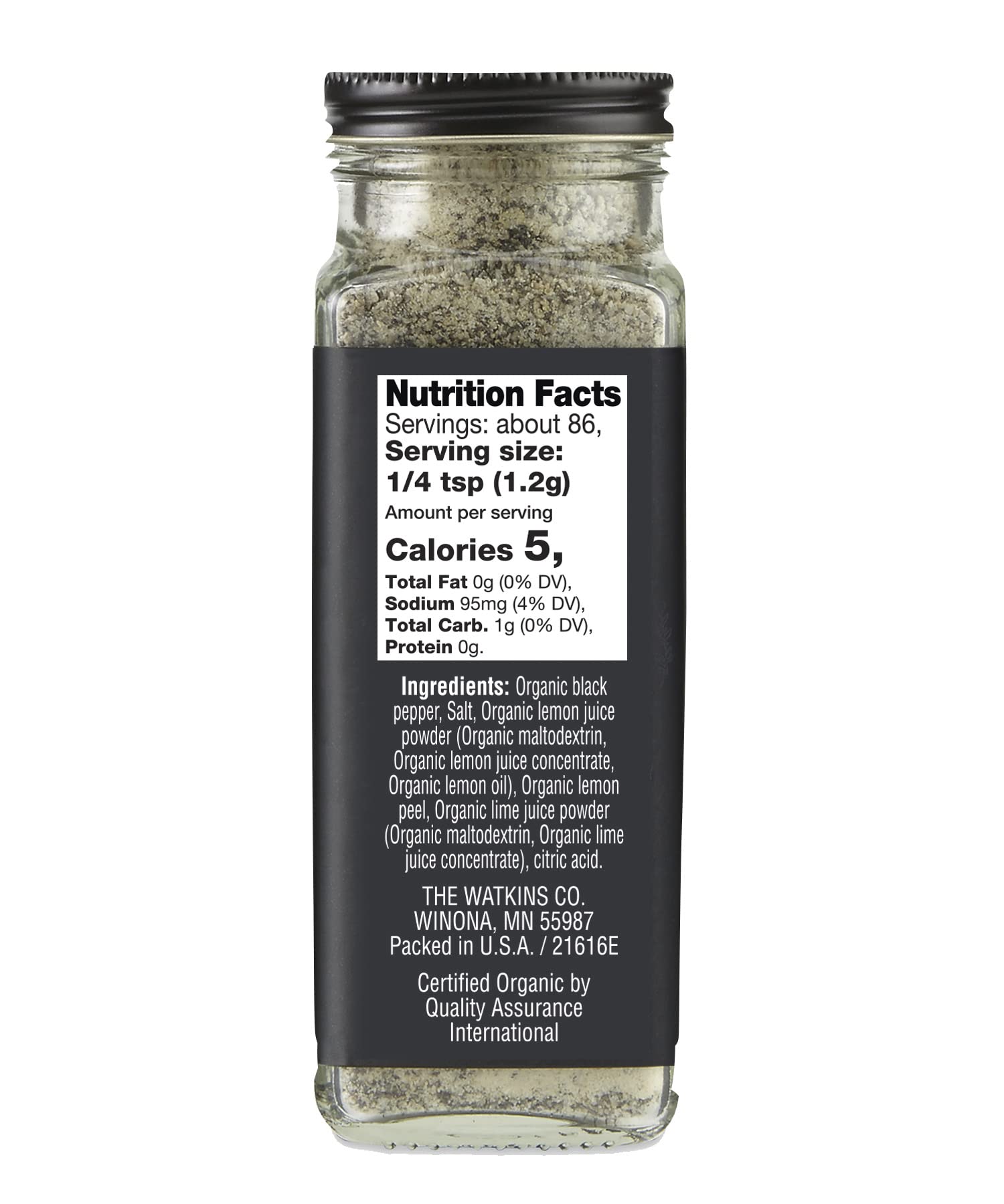 • Q: What are the main ingredients in Watkins Gourmet Organic Lemon Pepper Blend? A: Watkins Gourmet Organic Lemon Pepper Blend features a carefully crafted mix of organic spices that typically include lemon zest, black pepper, and other natural seasonings. This blend is USDA certified organic and is Non-GMO project verified.