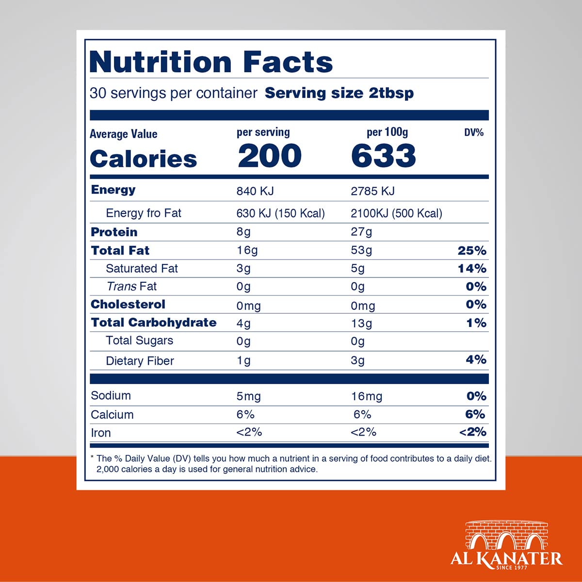 Q: What is Al Kanater Tahini made from?A: Al Kanater Tahini is made from 100% natural ground sesame seeds, ensuring a rich and creamy taste without any chemicals or whitening agents.