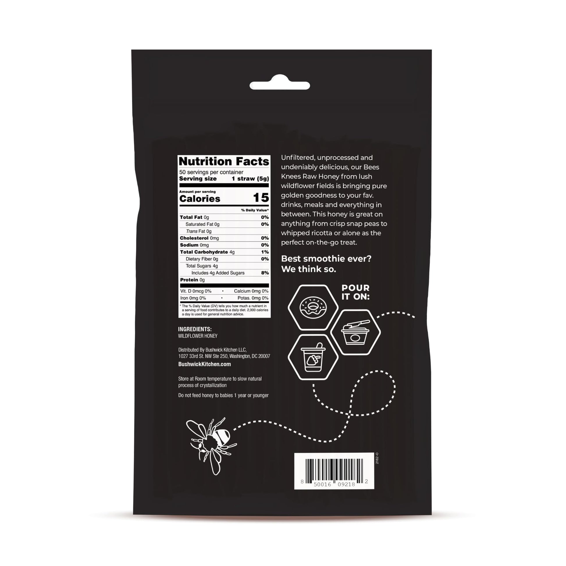 Q: What is the serving size of the Bees Knees Clover Honey Sticks?A: Each pack contains 50 honey sticks, with each stick offering approximately 1 teaspoon of honey, making it a convenient and portion-controlled way to enjoy honey.