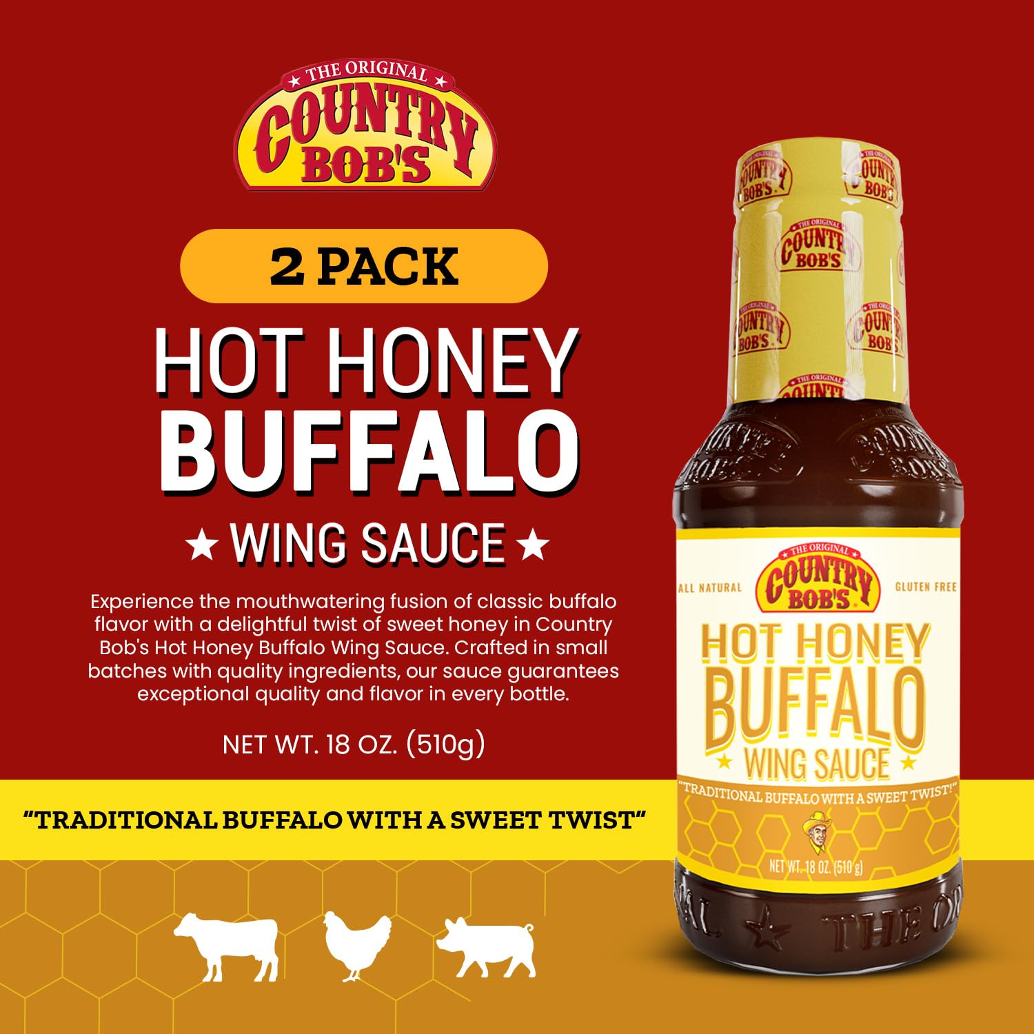 Q: What makes Country Bob's Hot Honey Buffalo Wing Sauce unique?A: Country Bob's Hot Honey Buffalo Wing Sauce stands out due to its flavorful fusion of classic buffalo taste combined with a sweet honey twist, creating a unique taste sensation that enhances any dish.