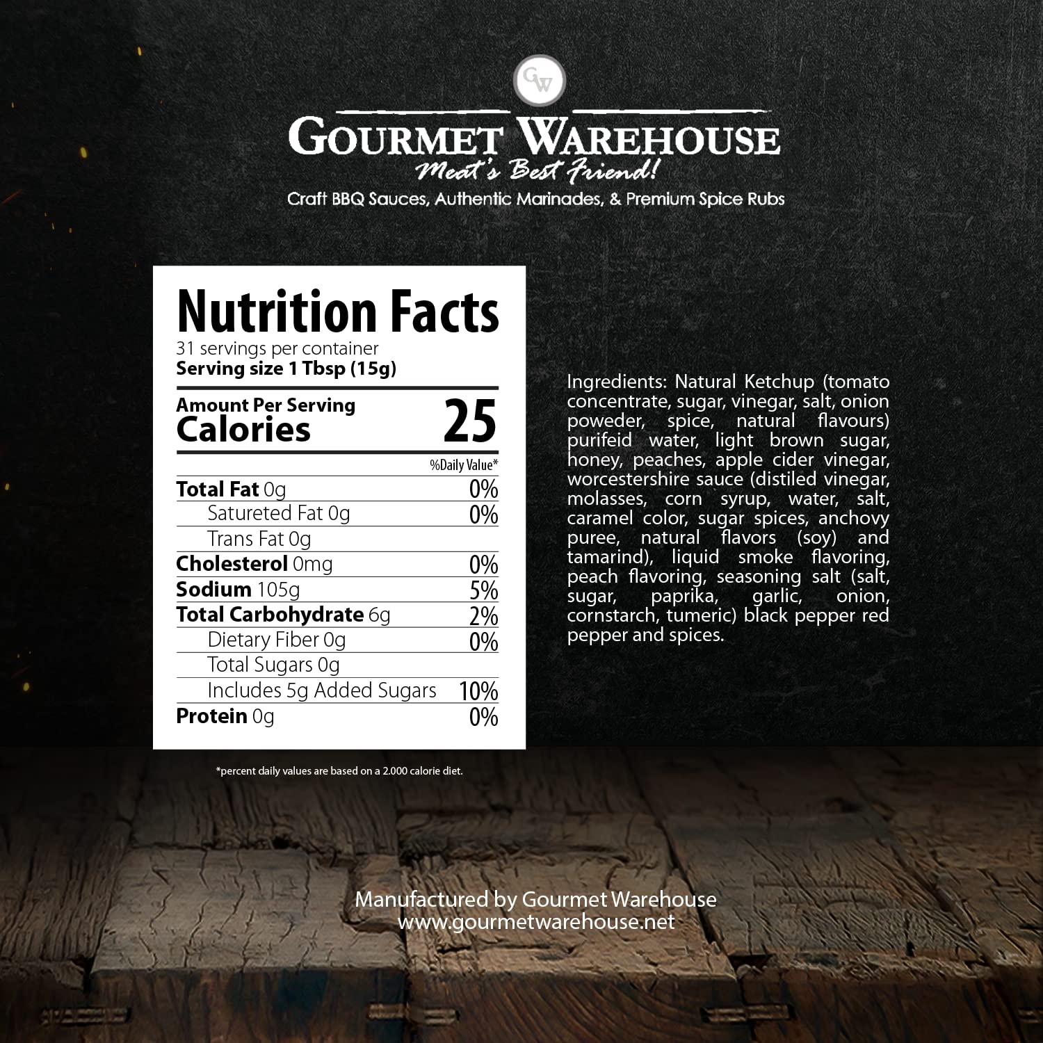 Q: What are the key ingredients in Gourmet Warehouse Smoky Peach BBQ Sauce?A: Gourmet Warehouse Smoky Peach BBQ Sauce is crafted using ripe peaches, light brown sugar, and a unique blend of smoky spices, ensuring a delicious flavor profile without any high fructose corn syrup.