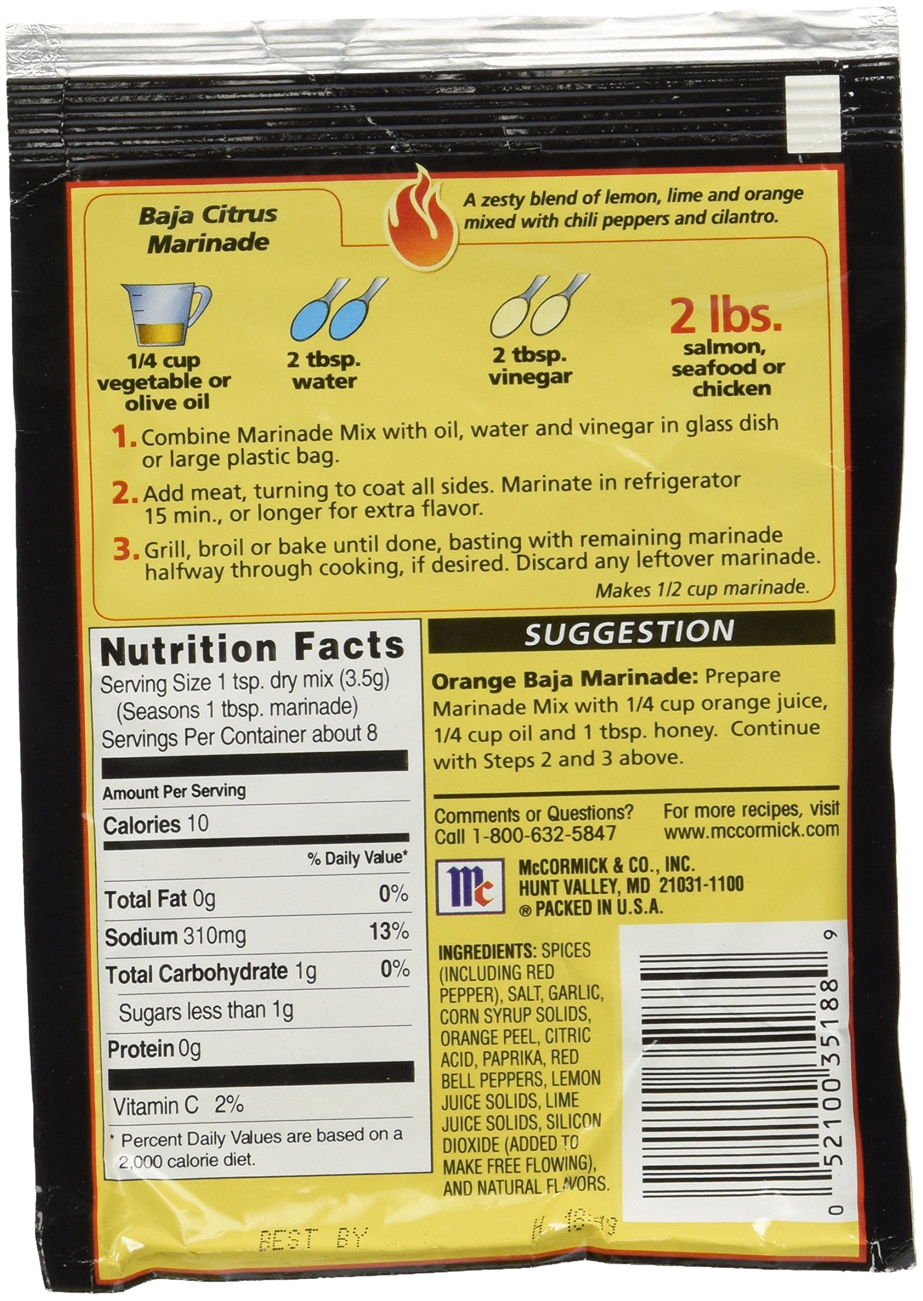 - Q: How much marinade is included in a pack of Grill Mates Baja Citrus Marinade? A: Each pack contains four 1-ounce packets of Grill Mates Baja Citrus Marinade, providing you with enough seasoning for multiple meals.