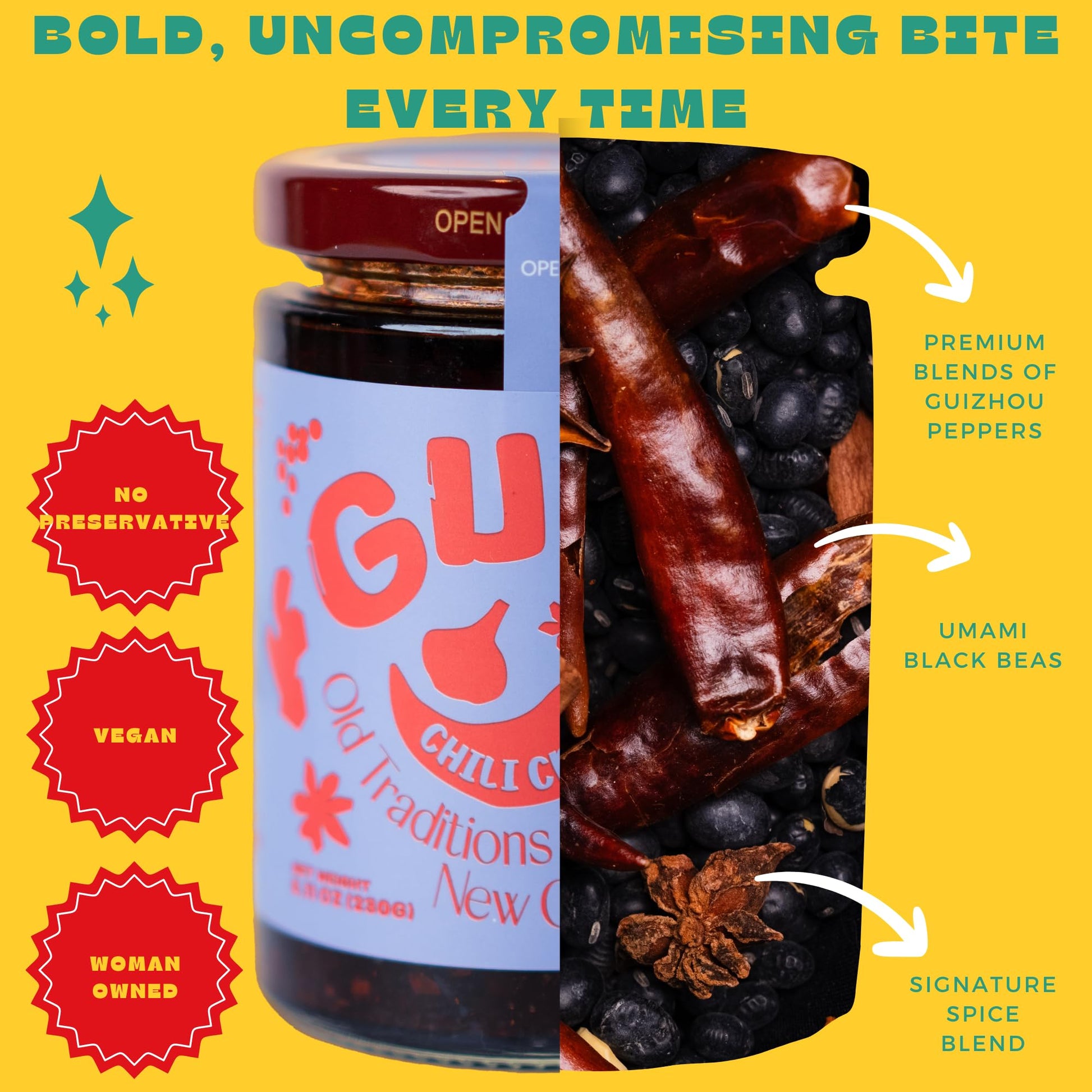 Q: What are the key ingredients in GUIZ Chili Crisp Sauce?A: The key ingredients in GUIZ Chili Crisp Sauce include Guizhou chili peppers, black fermented beans, and peanuts, all sourced to provide a rich, authentic taste that reflects the culinary traditions of Guizhou.