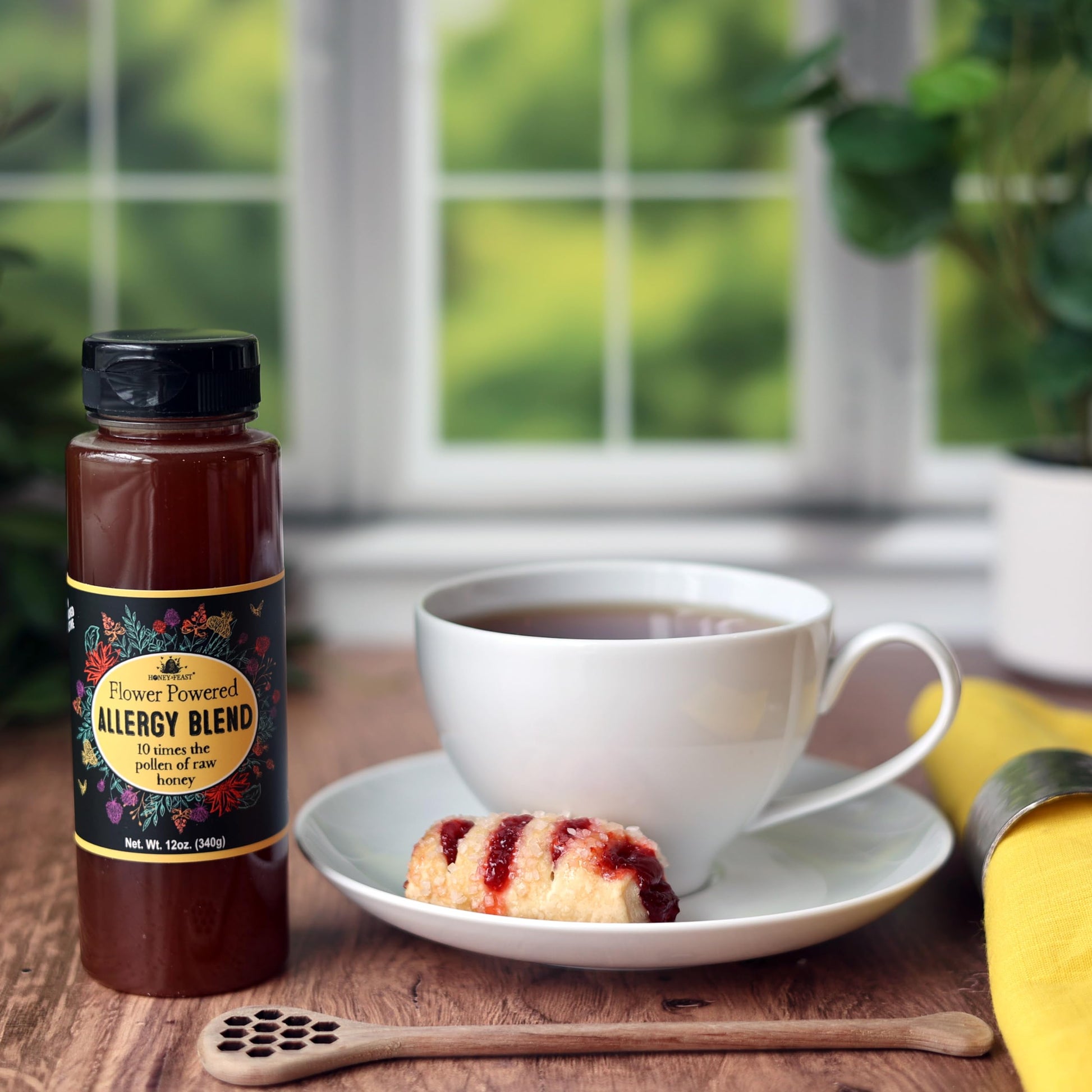 - Q: What makes Honey Feast Allergy Blend Honey different from regular honey? A: Honey Feast Allergy Blend Honey contains 10 times the pollen of ordinary honey, thanks to a unique infusion of pollen sourced from beekeepers across the country. This makes it an excellent choice for those seeking additional pollen to help with seasonal allergies.