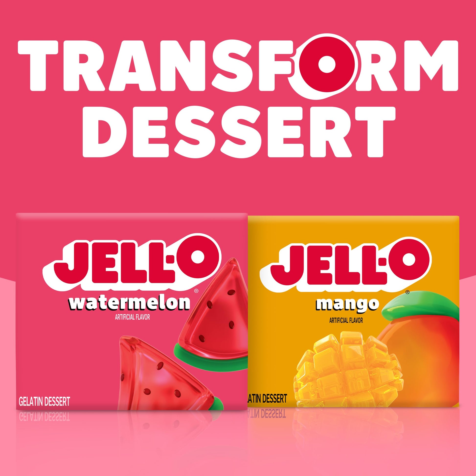Snack happy. Jell-O Watermelon Artificially Flavored Gelatin Dessert Mix lets you add some wonder to your day with a delicious snack. Spoon up a smile with our artificially flavored watermelon Jell-O gelatin that contains 90 calories per serving. Our colorful, jiggly treat is perfect for everyday snacking or special occasions with family and friends. Additionally, our gelatin dessert mix is a versatile ingredient for creating desserts like poke cakes, parfaits, pretzel salads, rainbow layer cakes and more. Our artificially flavored watermelon gelatin dessert is easy to prepare. Simply add 1 cup boiling water to the gelatin mix, stir for 2 minutes until completely dissolved, stir in 1 cup cold water, then refrigerate for 4 hours or until firm. Each Jell-O gelatin dessert mix is individually packaged in a 3-ounce sealed pouch and makes 4, 1/2-cup servings.