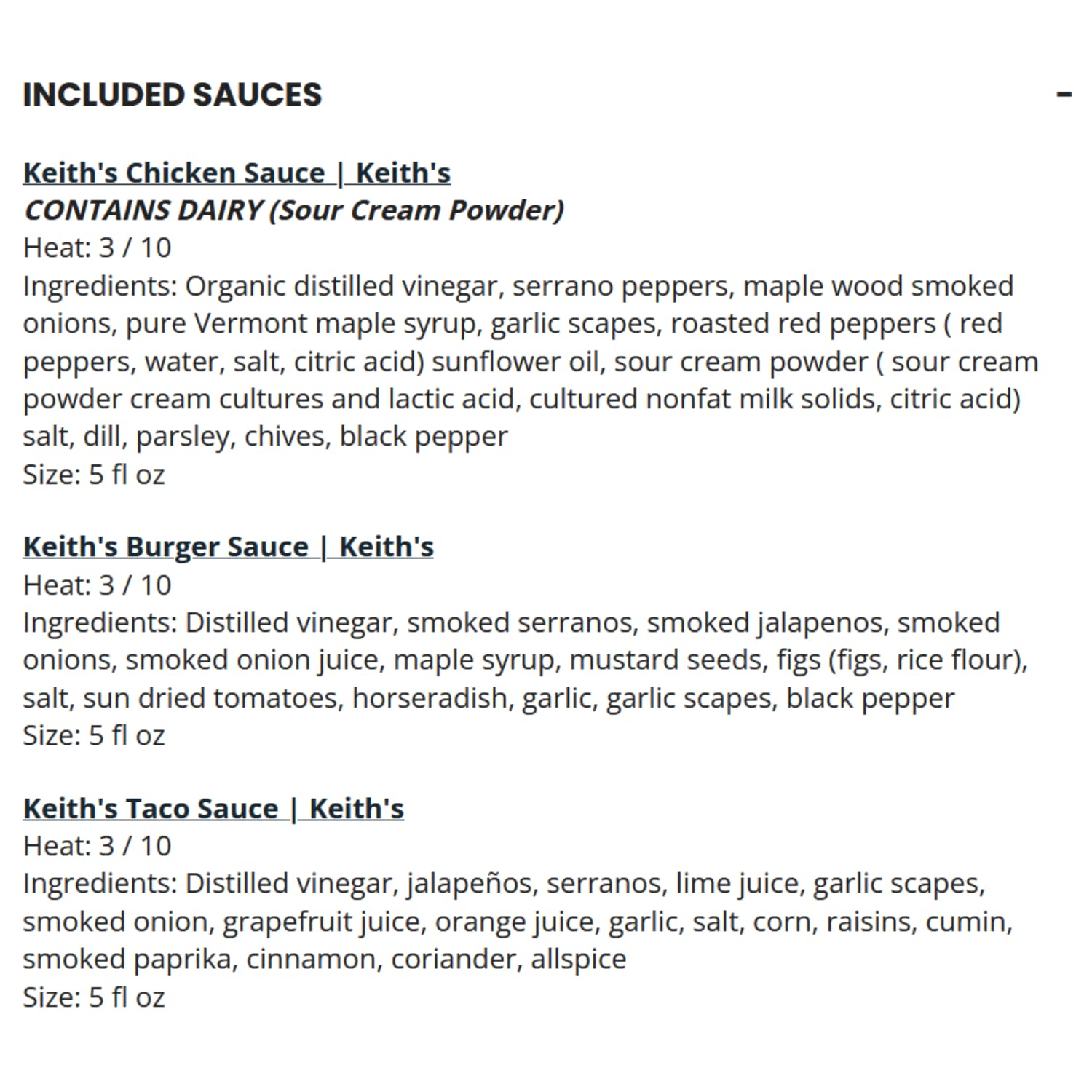 When Try Guys Keith Habersberger first approached us about creating a hot sauce based on his love of fried chicken, buffalo and ranch, we knew he was on to something. Fans couldnt get enough of Keiths Chicken Sauce for its tangy flavor and not-too-hot spice level. But that was just the opening chapter of Keiths hot sauce story. Introducing the ultimate tasty trio of Keiths Hot Sauces: Keiths Burger Sauce makes any burger a Habersburger with its sweet mustard base, while the newest addition, Keiths Taco Sauce, takes taco night to new heights with jalapenos, raisins and citrus. This pack is full of versatile flavors that are as delicious on their namesakes as they are on other stuff, meaning Keith has you covered for all your favorite meals. And the not-too-hot heat level means theyre perfect for spice novices and flavor hounds alike.