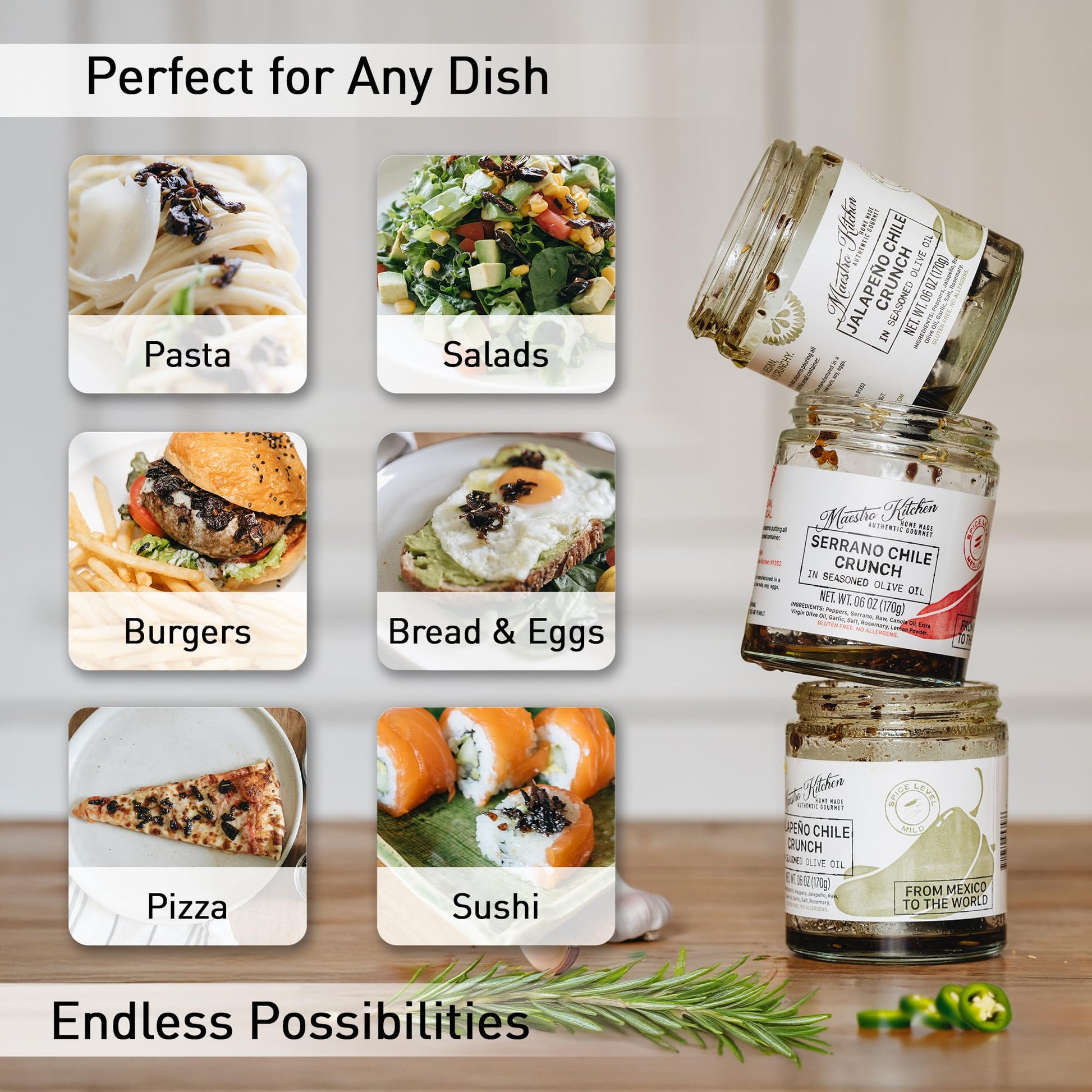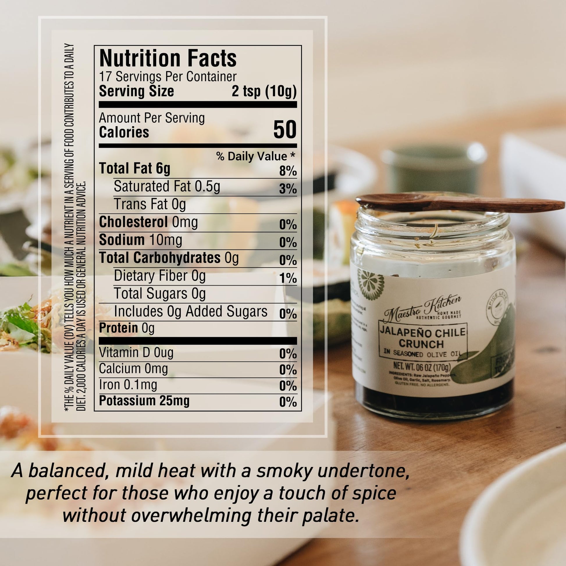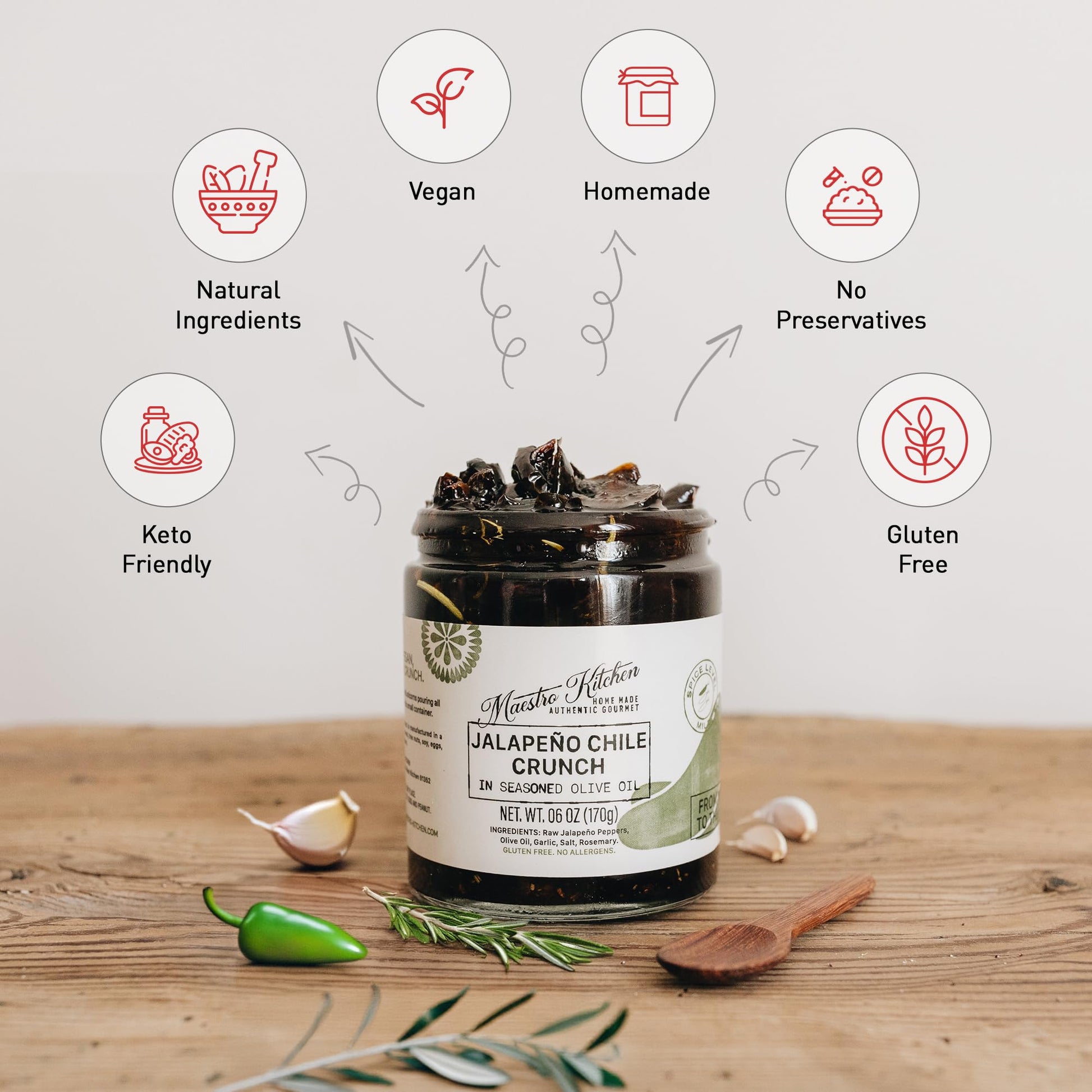 - Q: What makes Jalapeno Chile Crunch different from other chili oils? A: Jalapeno Chile Crunch stands out due to its artisanal small-batch production and authentic family recipe. Unlike mass-produced chili oils, it uses high-quality ingredients like extra virgin olive oil, fresh herbs, and real jalapeno peppers, ensuring a rich, robust flavor and satisfying texture.