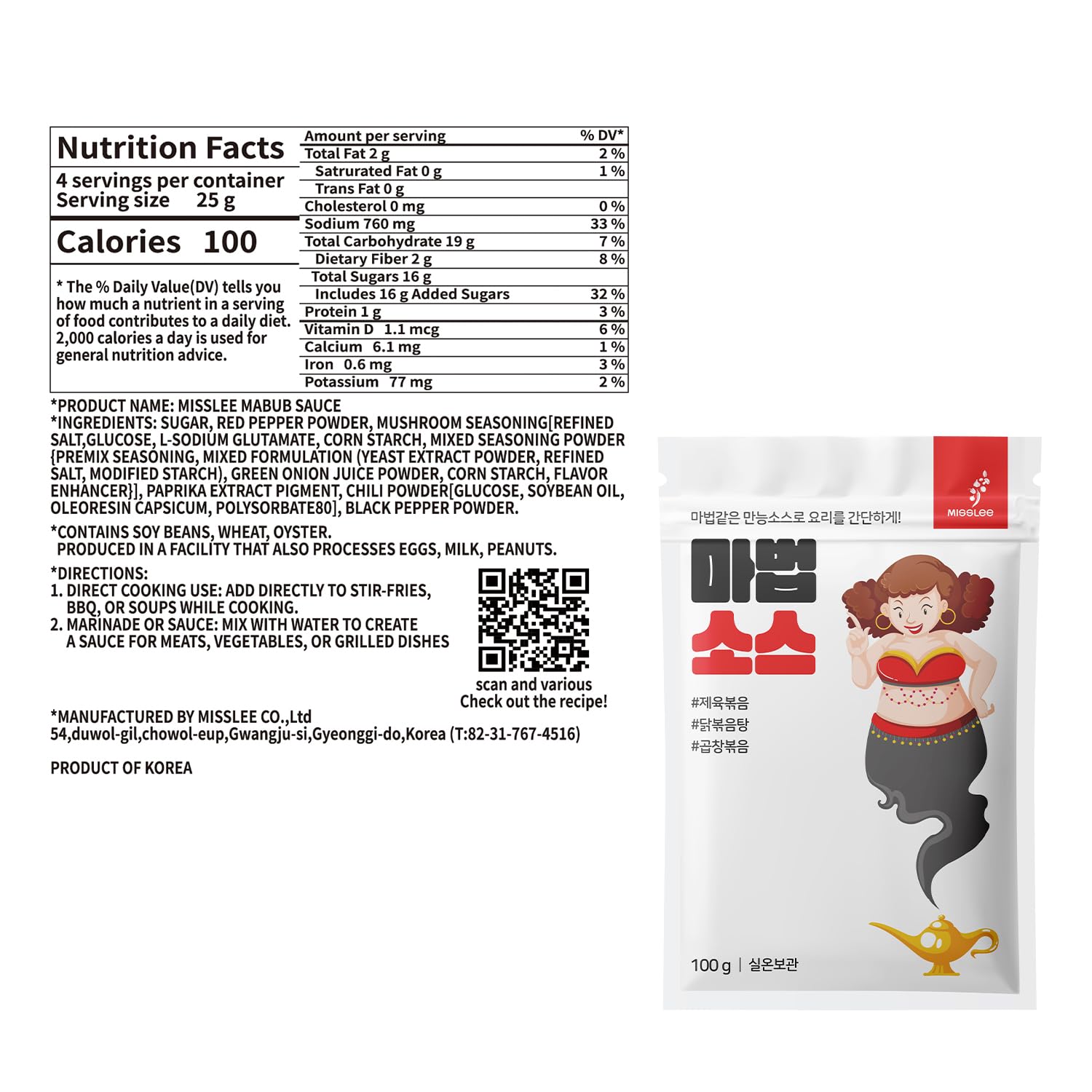 Q: What ingredients are in the MISSLEE Mabub Sauce?A: MISSLEE Mabub Sauce is made with premium Korean chili powder and natural seasonings, crafted to deliver a perfectly balanced kick of spice and authentic flavor.