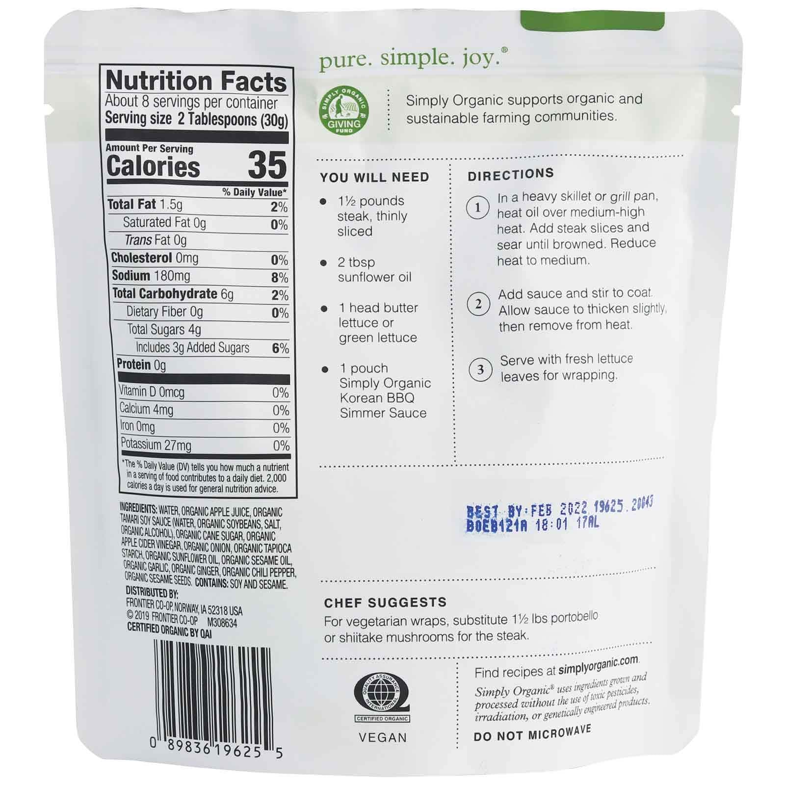 - Q: What can I use Simply Organic Korean BBQ Simmer Sauce for? A: Simply Organic Korean BBQ Simmer Sauce is versatile and can be used as a marinade for traditional Korean BBQ dishes, as well as a stir fry sauce for meats, vegetables, or plant-based proteins. Its sweet, savory, and tangy profile enhances various Asian-inspired entrees.