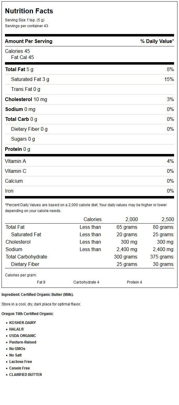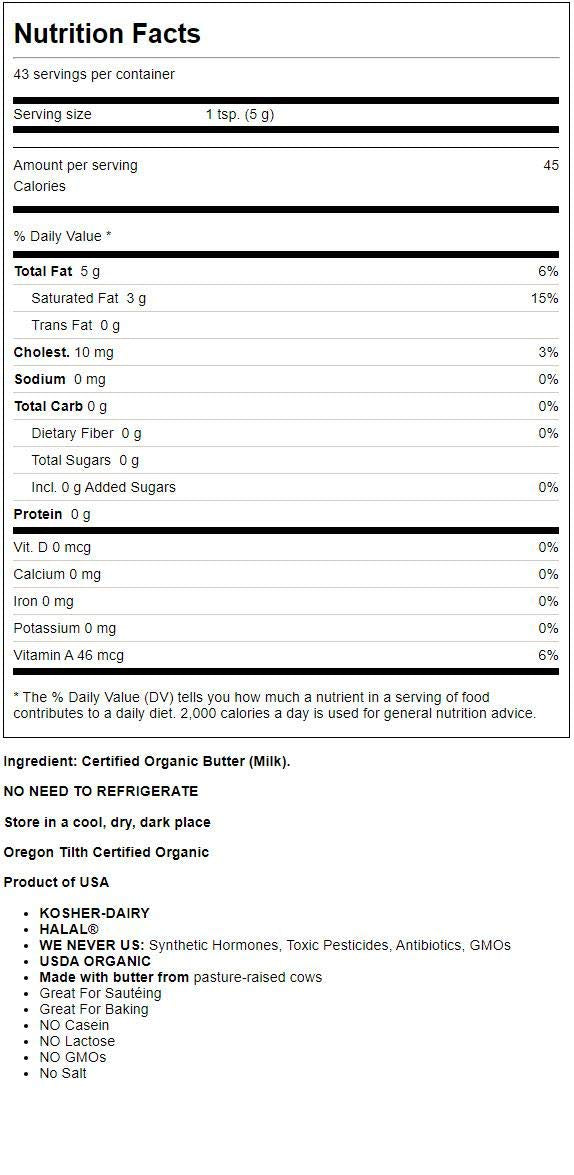 - Q: Is Organic Valley Ghee suitable for people with dietary restrictions? A: Yes, Organic Valley Ghee is lactose-free, casein-free, gluten-free, and contains no added salt, making it an excellent choice for individuals with dietary restrictions or sensitivities.