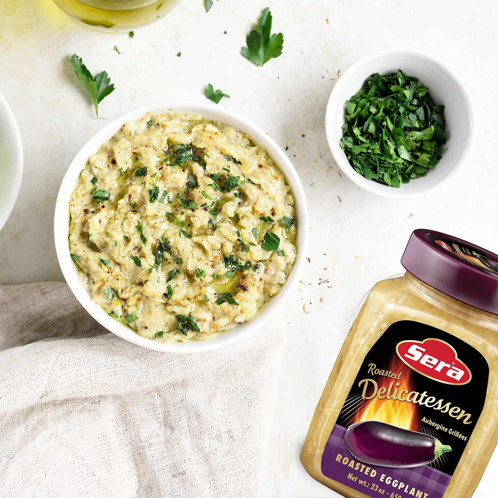 Q: How can I use Sera Roasted Eggplant in my meals?A: You can use Sera Roasted Eggplant as a dip for potato chips, a spread for sandwiches, or as an ingredient in dishes like Mutabbal and Baba Ganoush, making it versatile for various culinary applications.