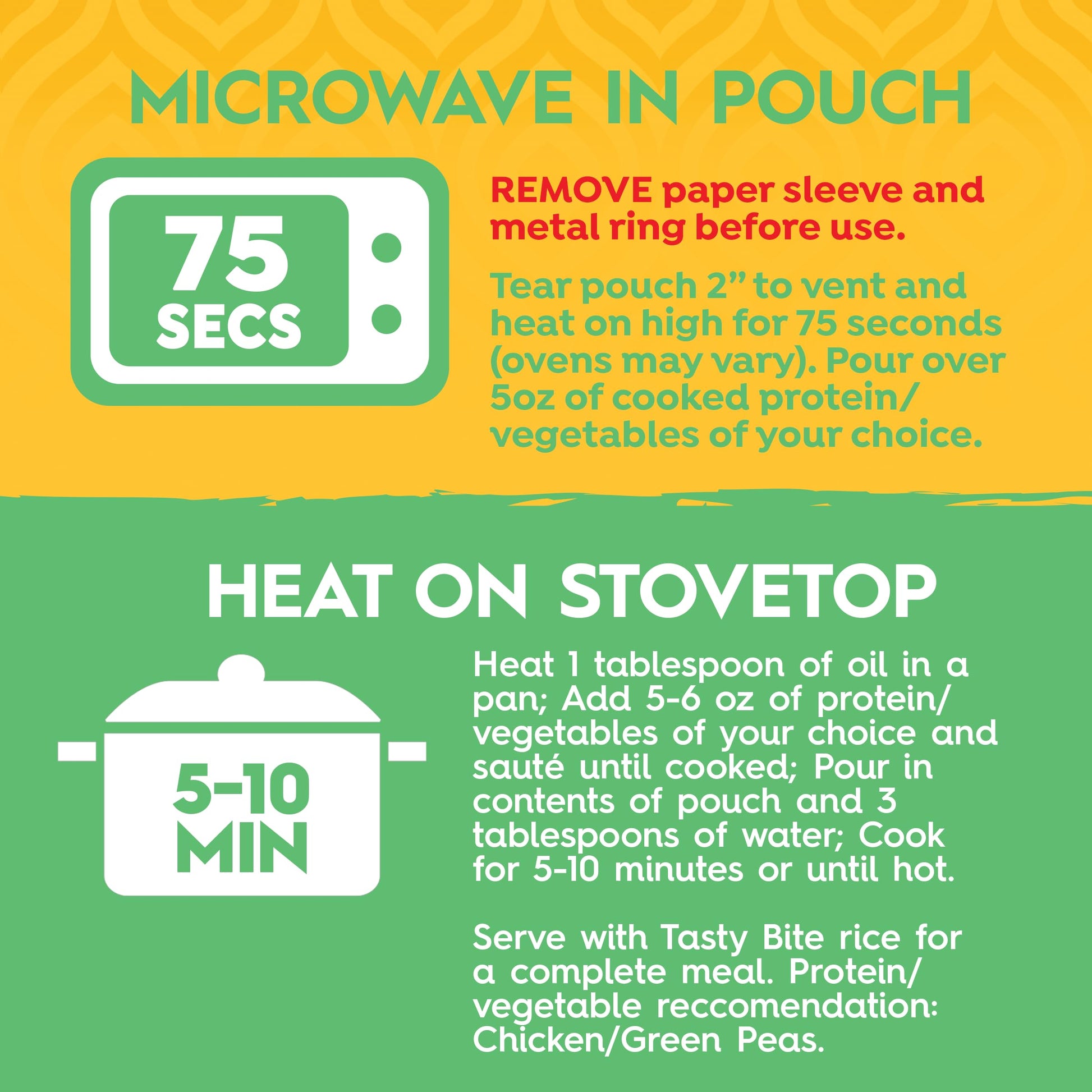 Q: How do I prepare the Tasty Bite Chennai Curry Simmer Sauce?A: You can prepare the sauce by venting the pouch and microwaving it for 75 seconds, then pouring it over rice or your choice of protein. For stovetop preparation, heat oil in a pan, sauté your protein and/or veggies, then add the curry sauce and water, cooking for 5-10 minutes until heated through.