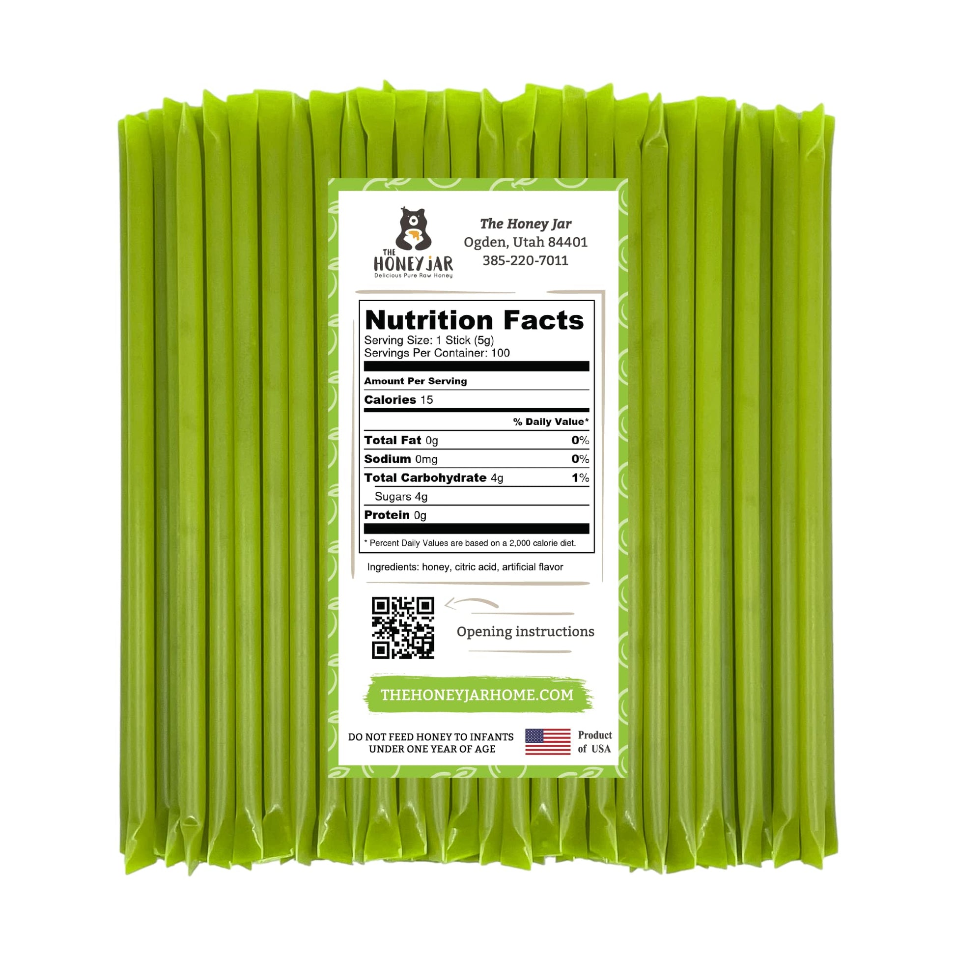 Q: What are Honey Jar Green Apple Flavored Raw Honey Sticks made from?A: Honey Jar Green Apple Flavored Raw Honey Sticks are made from pure, raw honey sourced from beekeepers in the USA. Each stick contains one teaspoon of flavored honey, with no added sugar, water, or artificial flavors.