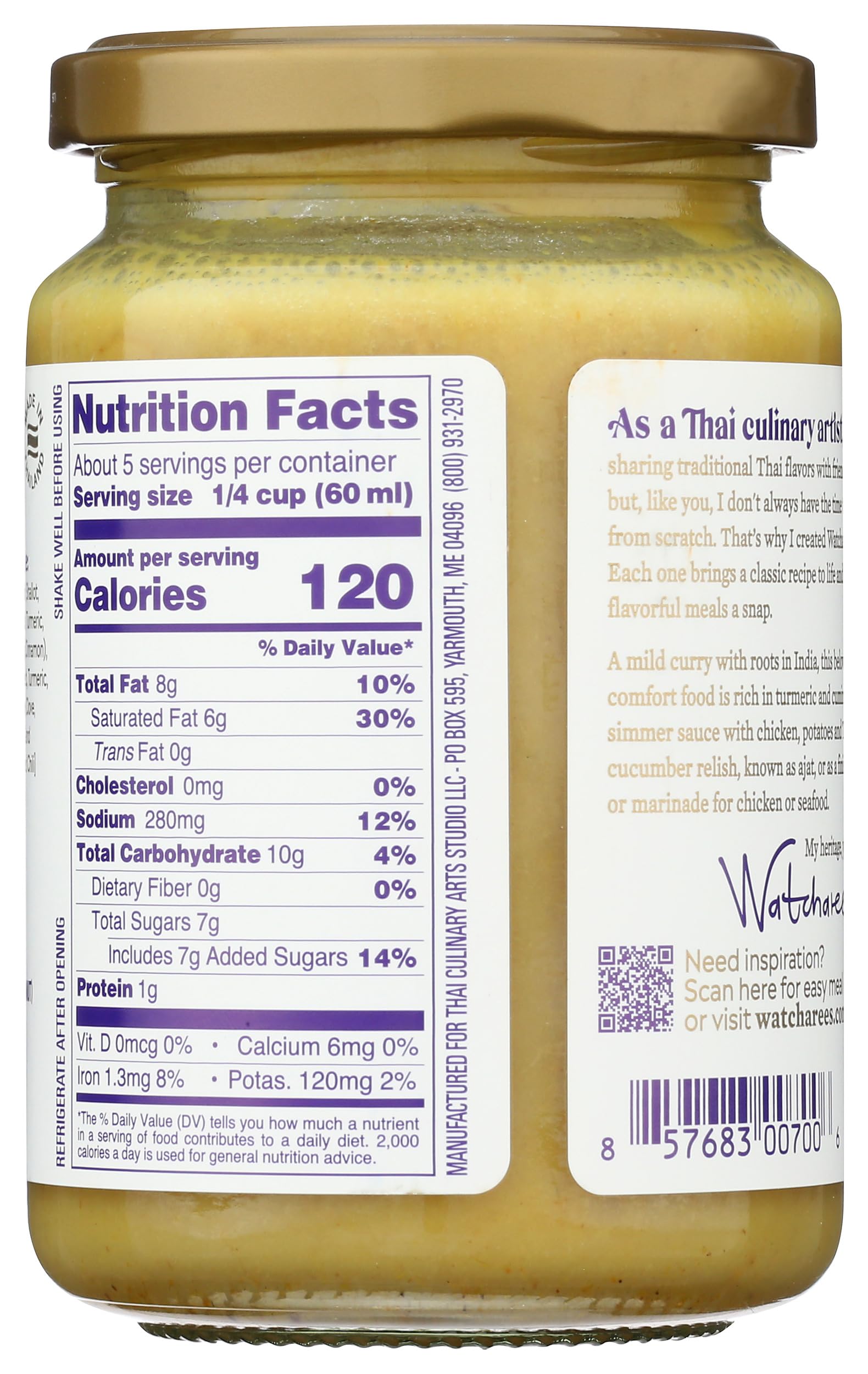 - Q: What makes WATCHAREE'S sauce different from other curry sauces? A: What sets WATCHAREE'S Thai Yellow Curry Sauce apart is its authentic recipe crafted by a culinary artist trained in Thailand, using premium natural ingredients that deliver a rich, traditional flavor without any artificial additives.