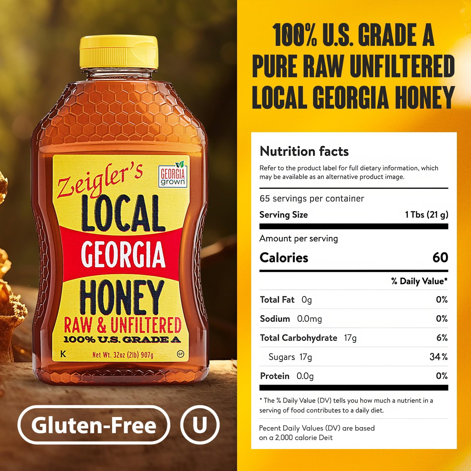 - Q: What makes Zeigler's Georgia Honey different from other honey brands? A: Zeigler's Local Georgia Honey is unique due to its all-natural, raw, and unfiltered composition, sourced directly from local Georgia hives. It contains no added sugars or flavors and is non-GMO, preserving the honey's natural vitamins, enzymes, and rich flavor.