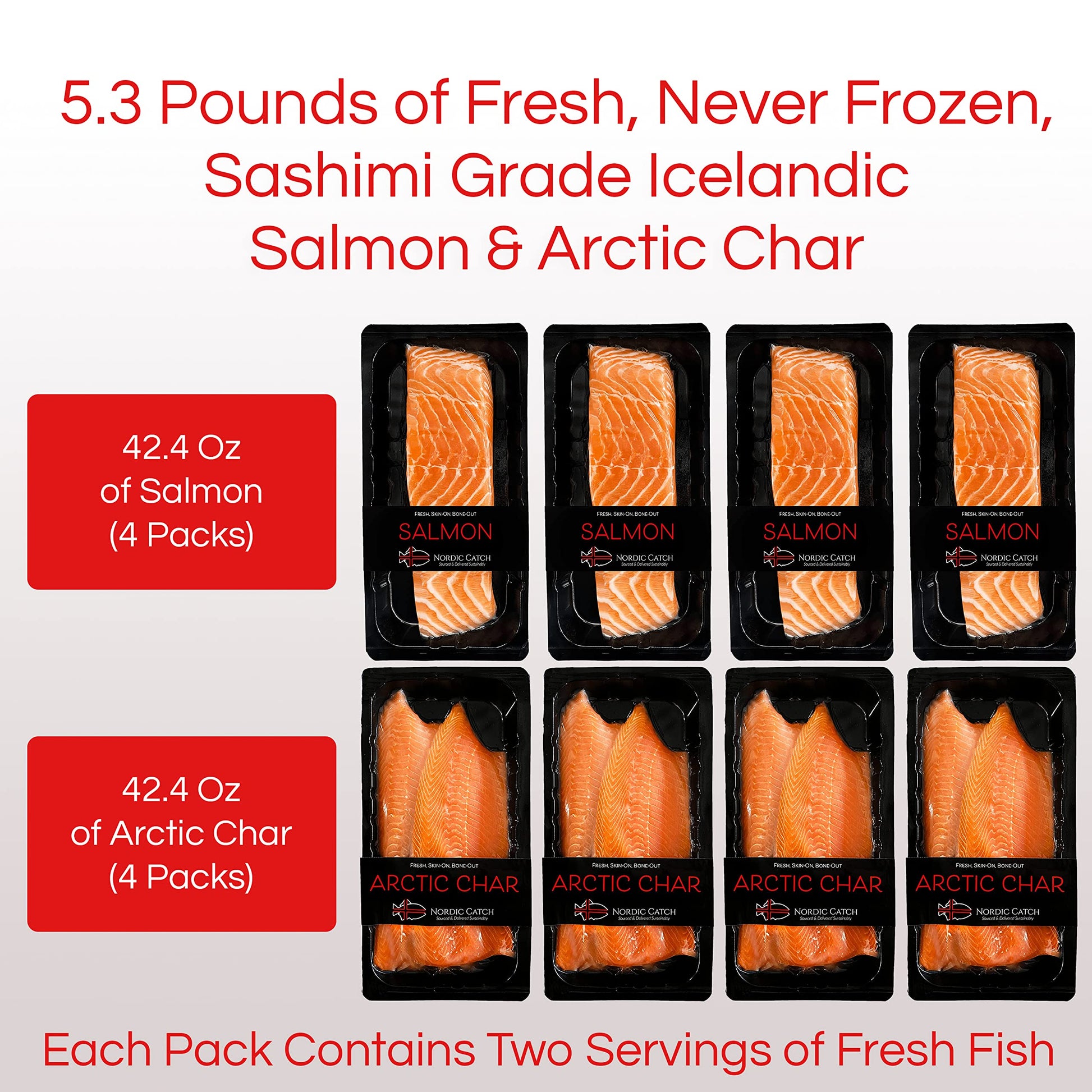 - Q: What makes Nordic Catch salmon and Arctic char different from other seafood options? A: Nordic Catch salmon and Arctic char are sustainably sourced from the cold, clean waters of Iceland. Our seafood is sashimi-grade, air-tight sealed for optimum freshness, and never frozen, ensuring you receive the highest quality product with rich flavor and nutritional benefits.