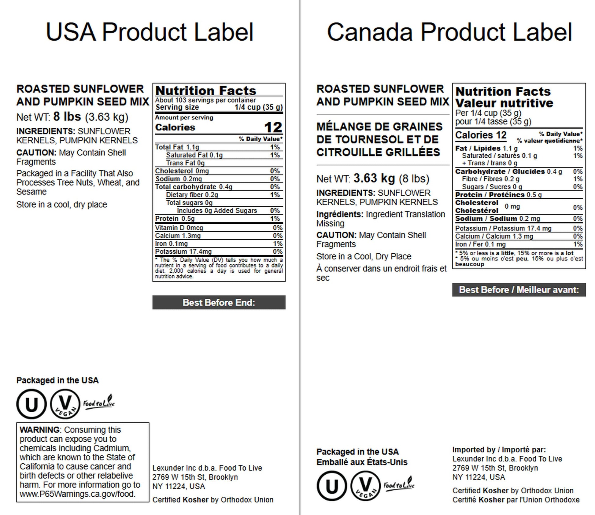 - Q: Is the product kosher certified? A: Yes, the Food to Live Dry Roasted Sunflower and Pumpkin Seed Mix is kosher certified.