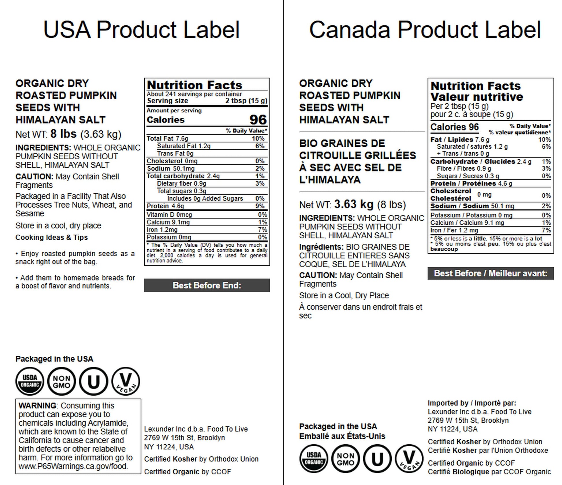Q: How can I use food to live organic pumpkin seeds in my meals?A: You can enjoy these organic pumpkin seeds as a healthy snack on their own, or you can add them to salads, smoothies, or baked goods for an extra crunch and nutritional boost.