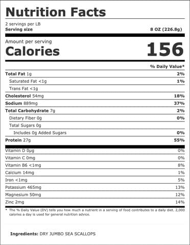 - Q: What is the nutritional value of Dry Diver Sea Scallops? A: Dry Diver Sea Scallops are a lean source of protein and are rich in omega-3 fatty acids, essential vitamins, and minerals, making them a nutritious addition to any meal.