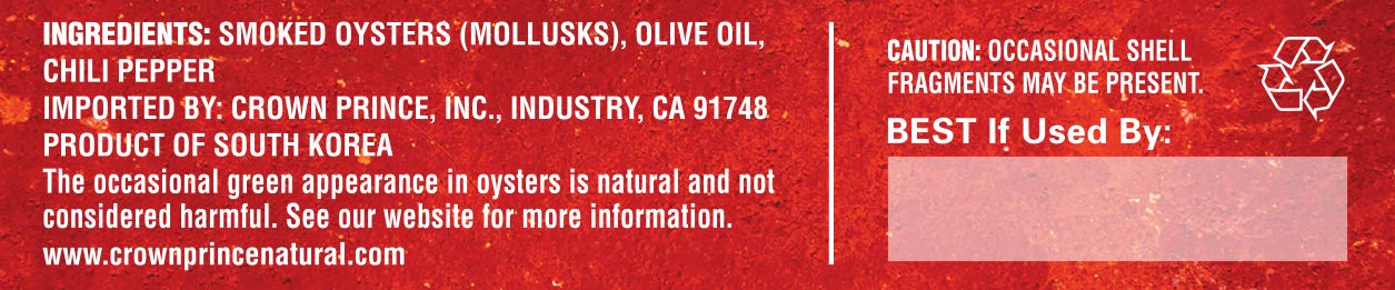 • Q: What are the main ingredients in Crown Prince Natural Smoked Oysters? A: Crown Prince Natural Smoked Oysters are made from sustainably harvested oysters packed in pure cold pressed olive oil, with red chili pepper added for flavor.