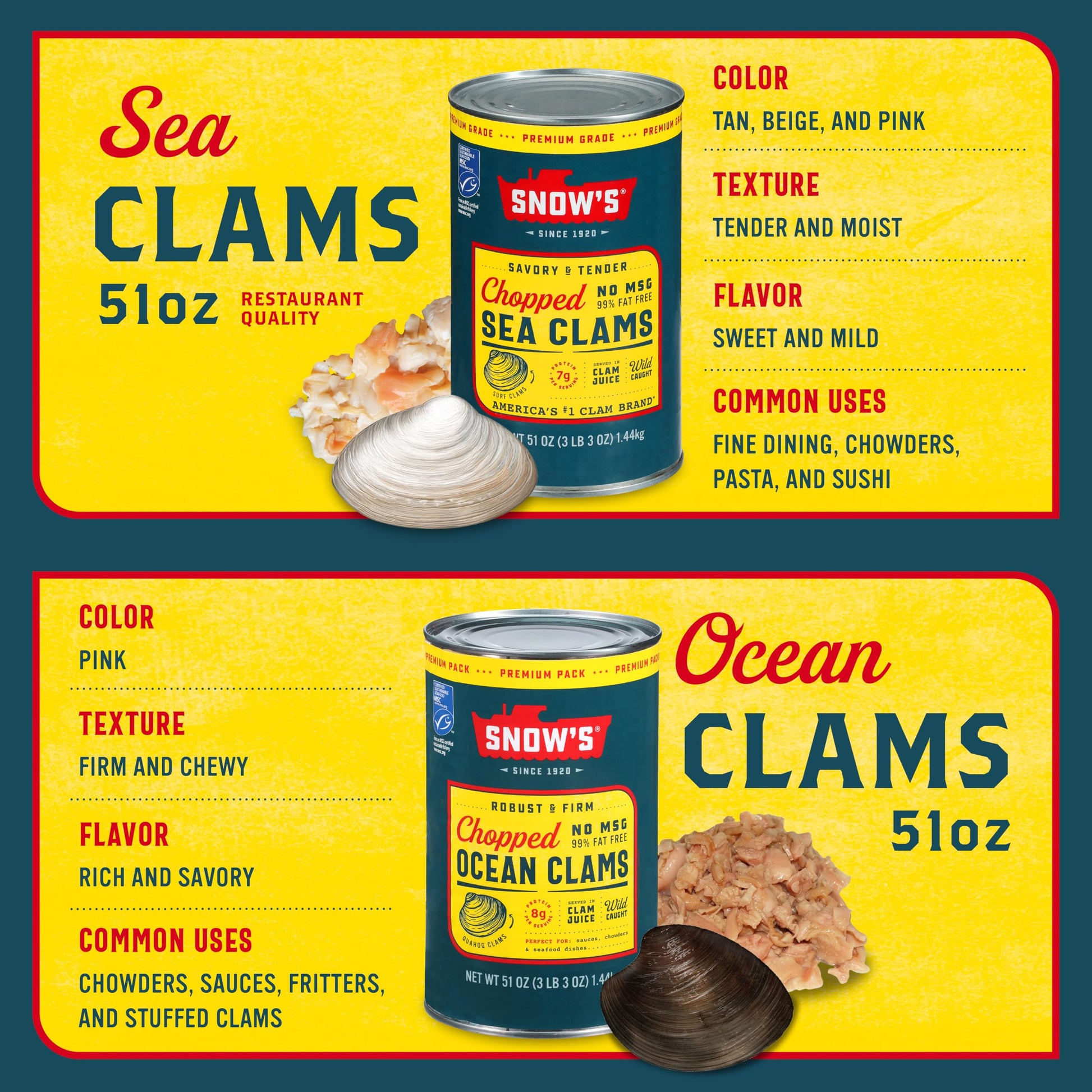 Snows Ocean Chopped Clams (also known as quahogs) are hearty in size and canned in their own juices to preserve their flavor and texture. Our chopped clams are perfect in chowders, soups, stews, sauces, or any seafood recipe. Its probably why weve been a New England favorite since 1920. Today, we continue pouring that hearty tradition into every can so clam fans everywhere can enjoy that authentic New England taste. As a global seafood company, we recognize our responsibility to the health of our oceans, and thats why we work to support sustainable fishing and ocean restoration initiatives.
