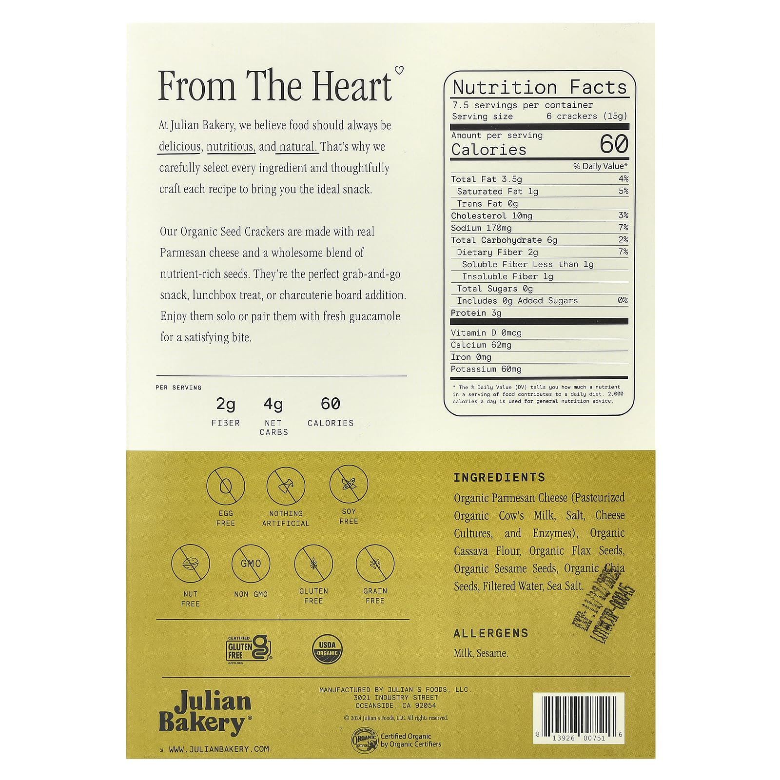 Julian Bakery Organic Seed Crackers - Parmesan 4oz | Gluten Free and Organic Certified | Grain Free | Low Carb