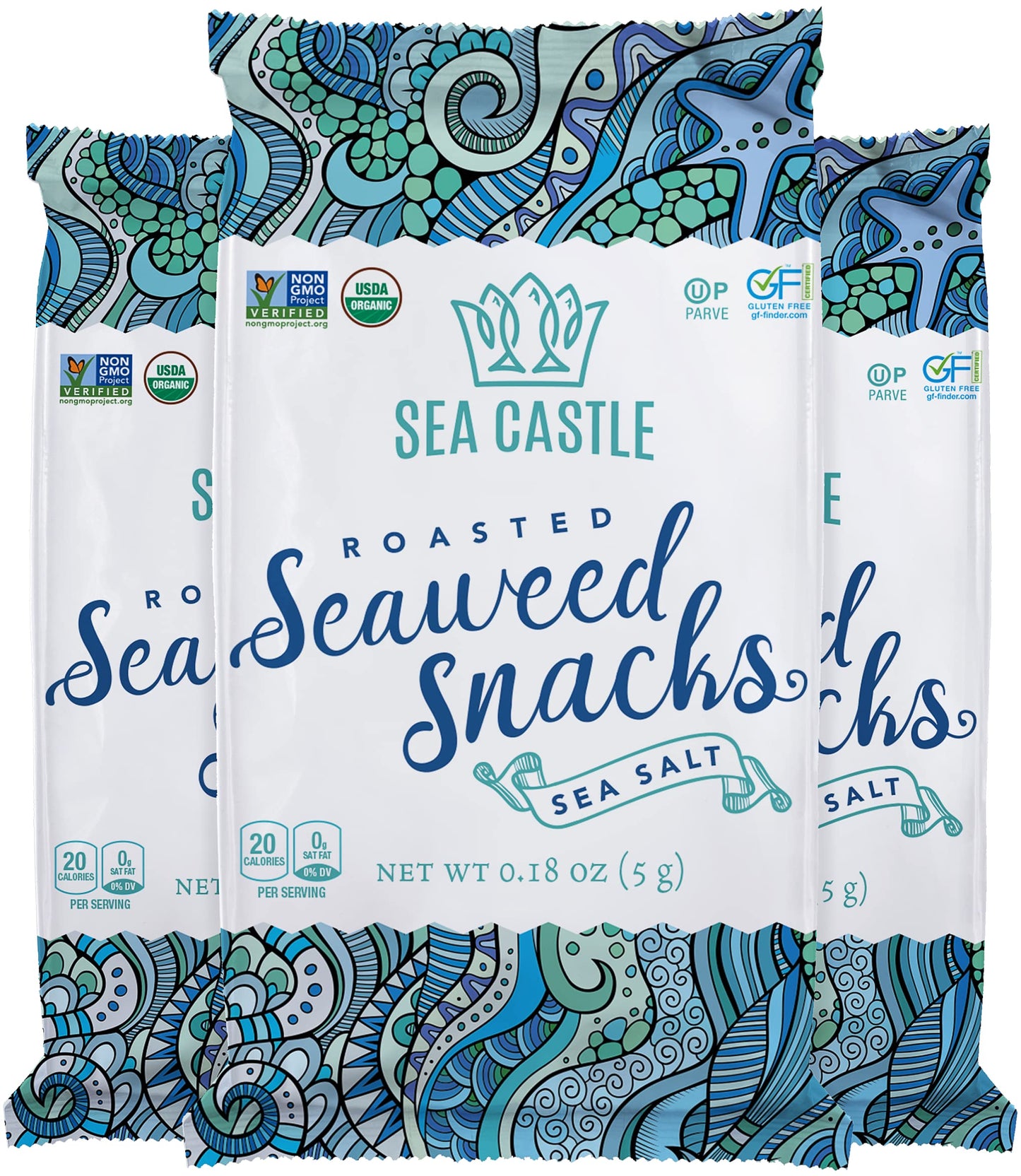 Sea Castle Organic Roasted Seaweed Snack with Sea Salt .18oz. (3 Pack) Gluten Free, Keto Friendly, Non GMO Verified, Kosher