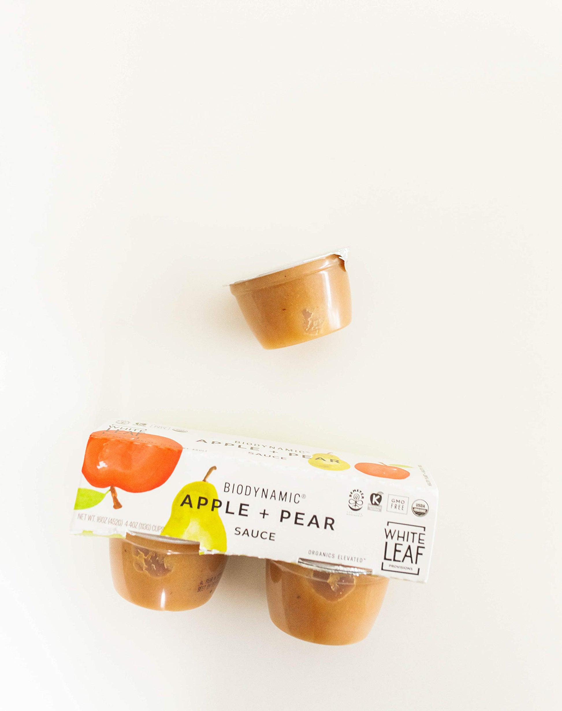 Q: What ingredients are used in the White Leaf Provisions Biodynamic Organic Apple + Pear Sauce Pack?A: The White Leaf Provisions Biodynamic Organic Apple + Pear Sauce Pack contains organically grown apples and pears, specifically Jonagold and Granny Smith apples along with Red Bartlett and Bosc pears. It is made without preservatives or artificial ingredients.