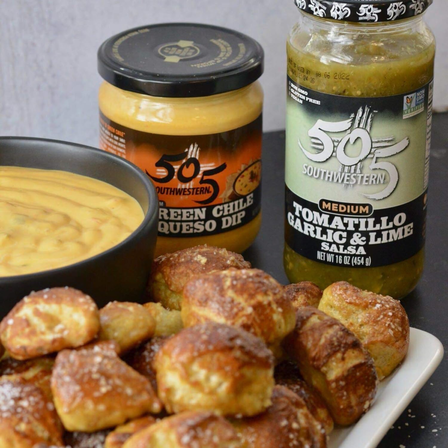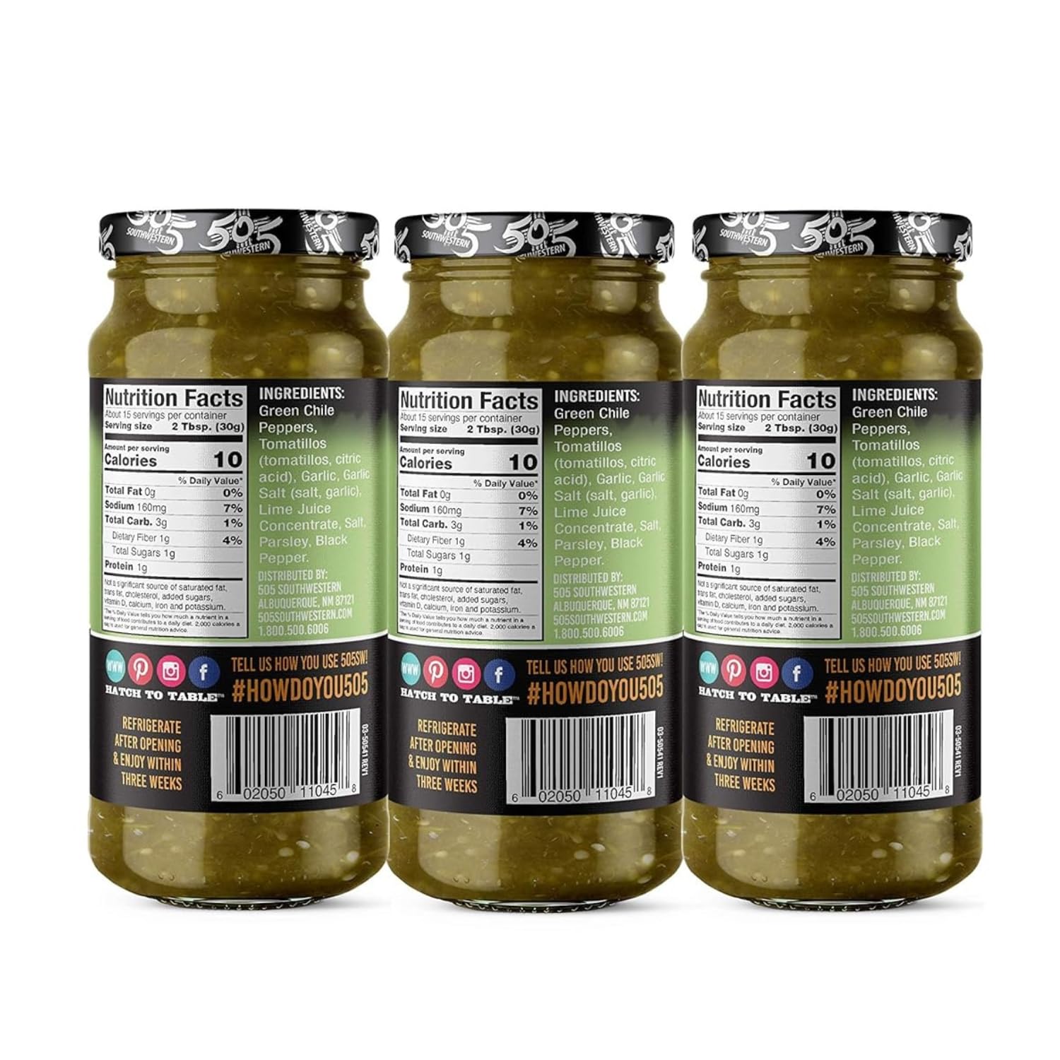 Q: What ingredients are in 505 Southwestern Tomatillo Garlic with Lime Salsa?A: The salsa features fresh vine-ripened tomatillos, a hint of garlic, a squeeze of lime, and premium green chiles, creating a uniquely flavorful combination.