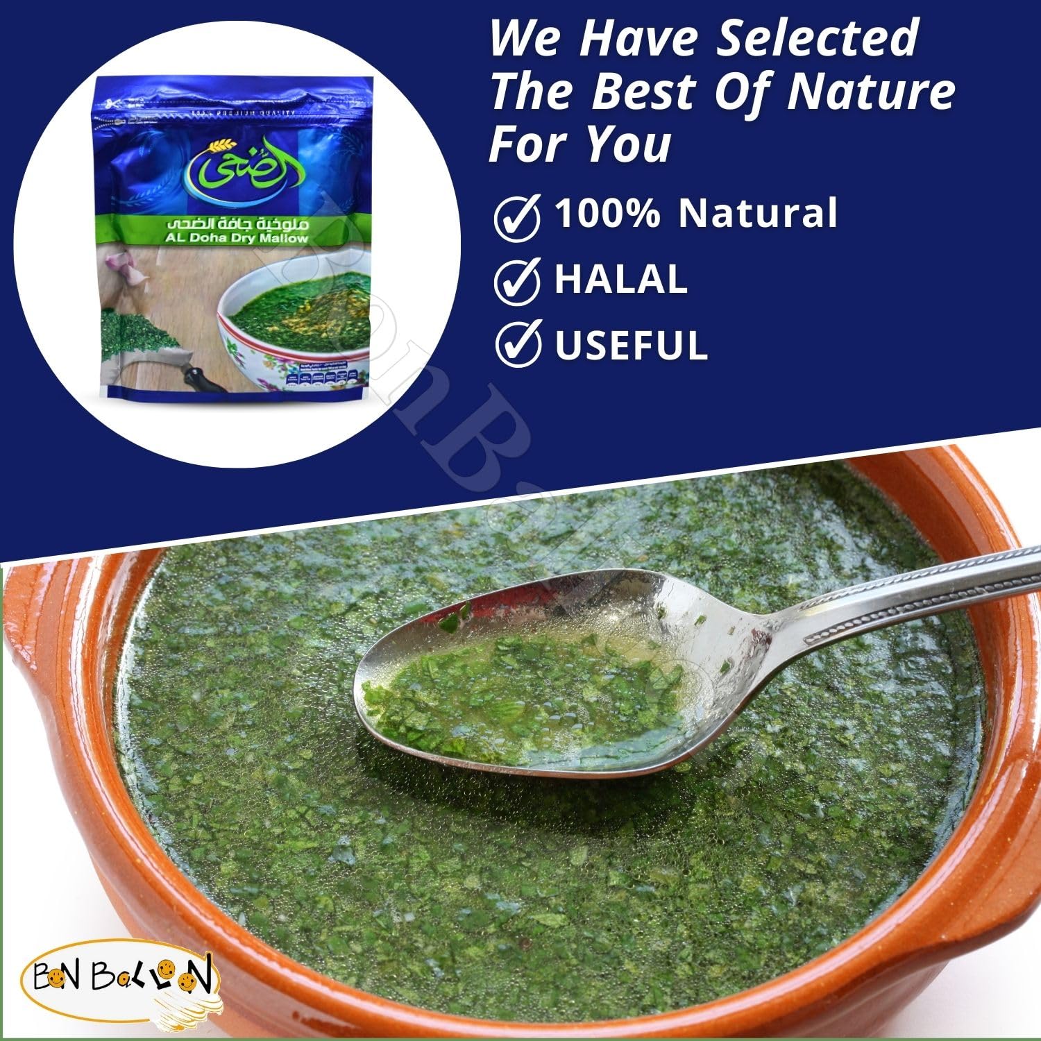 Al Doha Dry Mallow Premium Egyptian Mallow Spinach Dried Molokhia Molocheya Mulukhiyah Doha Eldoha El Doha For Cooking ?????? ????? The Plant Is Known As Molohiya Or Molocha And Is Usually Cooked Into A Kind Of Chicken Stew .The Leaves Of Corchorus Have Been A Staple Egyptian Food Since The Time Of The Pharaohs And It Is From There That It Gains Its Recognition And Popularity . Varieties Of Mallow-Leaves Stew With Rice Is A Well Known Middle Eastern Cuisine . The Most Egyptian National Famous And Popular Dish 100 % Natural Dried Pure 100% Dried Pure And Natural Quantity : 2 Pack Weight (Approx.) : 7 Oz / 200 Gm Material : 100% Natural And Pure . How To Prepare : Duha Molokhia Bag 100 G - 10 Cloves Minced Garlic - 1 Cup Tomato Juice - Salt To Taste - 1 Teaspoon Cumin - 1 Teaspoon Dry Coriander - 1- 4 Tsp Spices 2 Cup Of Soup - 1 Tablespoon Of Butter Prepare Garlic In Butter Until It Turns Yellow , Then Add A Cup Of Tomato Juice With Salt , Cumin And Coriander And Leave Until Pouring , Then Add The Soup To Boiling Then Leave It On Low Heat And Add Molokhia Together Stirring Until It Reaches The Desired Strength And Then Serve It Hot
