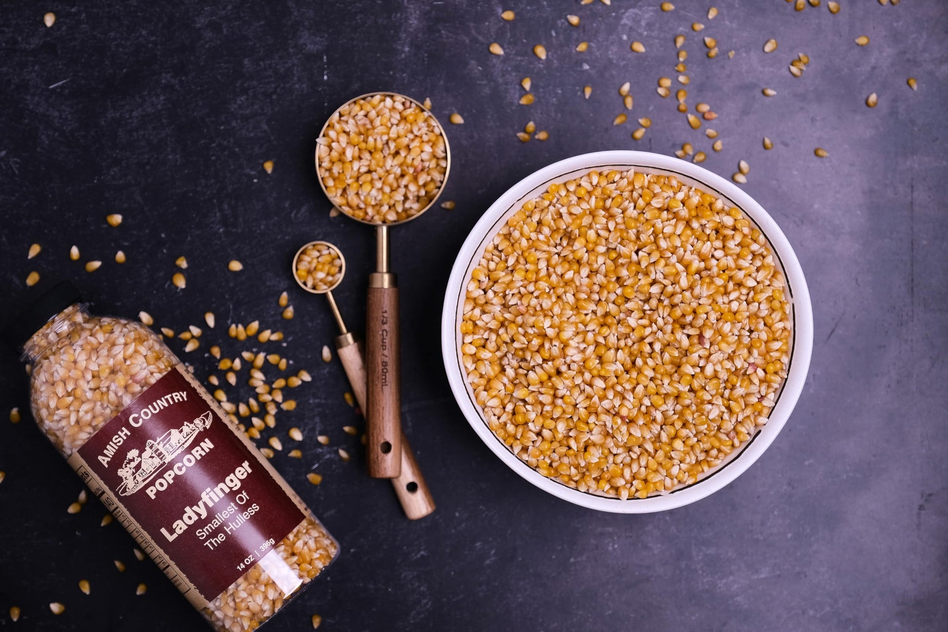 Q: What are the ingredients in Amish Country Popcorn?A: Amish Country Popcorn is made from high-quality ladyfinger popcorn kernels that are Non-GMO and gluten-free, ensuring a wholesome snacking experience.