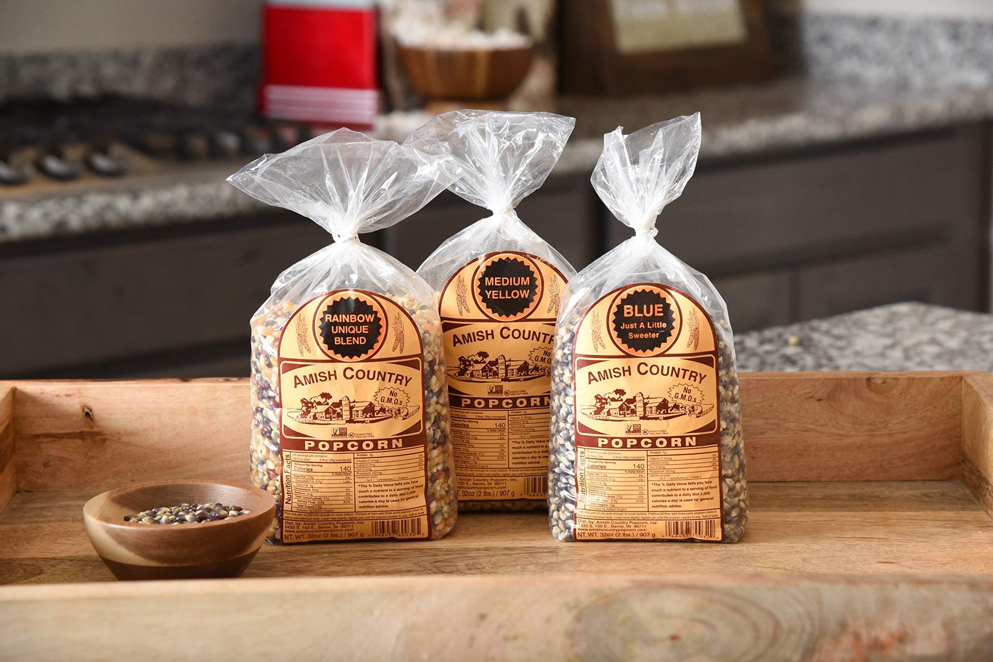 - Q: What types of kernels are included in the Amish Country Popcorn package? A: The Amish Country Popcorn package includes three different types of kernels: Rainbow, Medium Yellow, and Blue Kernels, each in a 2 lb bag.